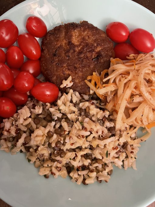 | Riz complet, lentilles vertes, quinoa rouge cuisinés à l’huile d’olive 3,2% et au basilic |