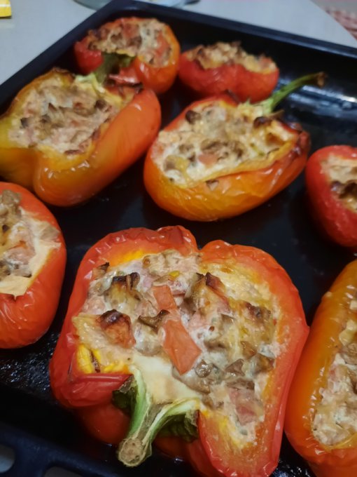 Начинка: творожный сыр, твердый сыр, помидоры и шампиньоны. Смешать, запихнуть в половинки перчиков и запекать это все минут 40-50