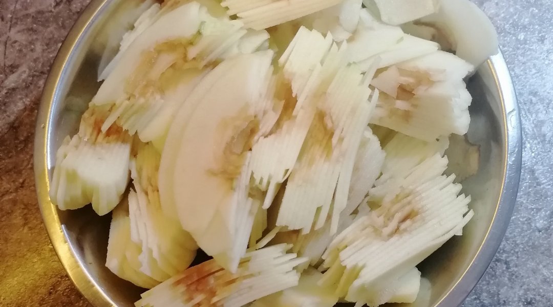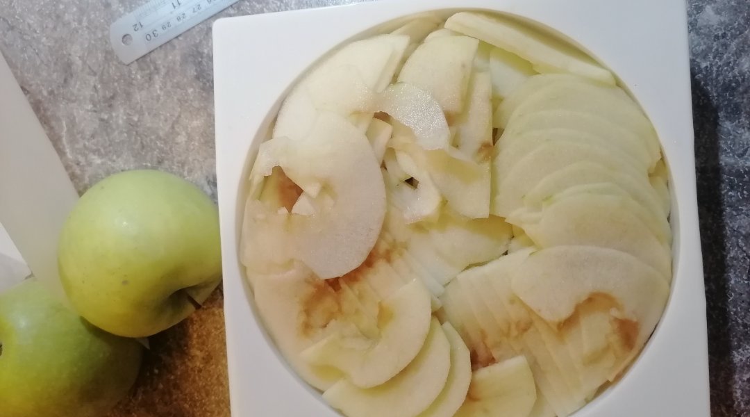 Яблоки (1 кг, зелёные) очистить, разрезать пополам и нарезать