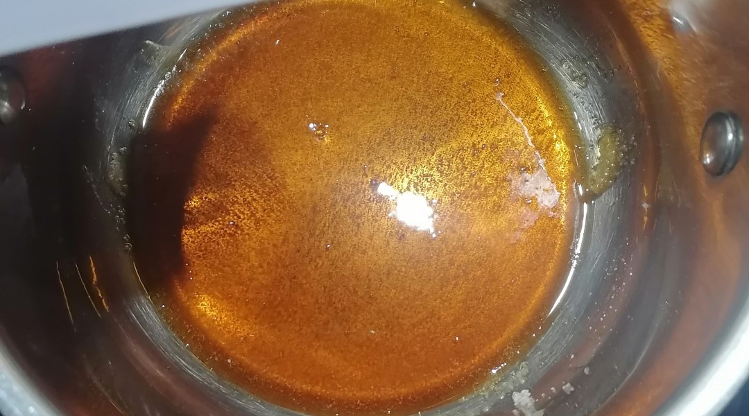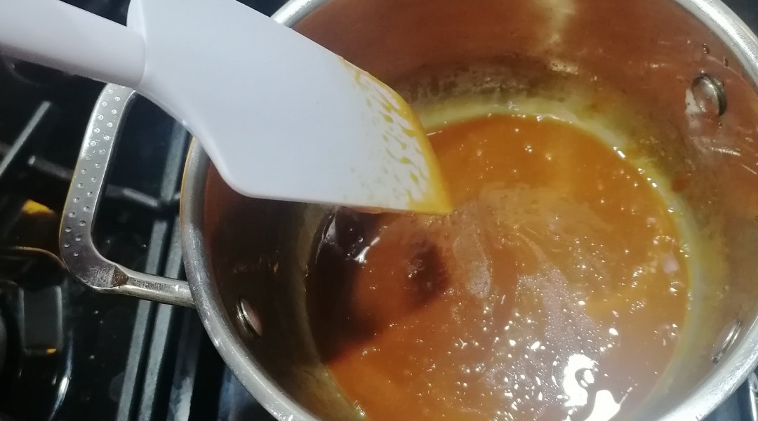 Ввести масло и перемешать до однородности. Вылить карамель на дно