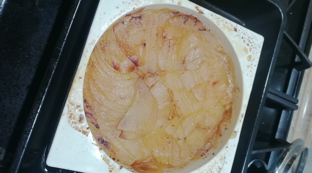 Через 40 минут вынуть яблоки, снять гнёт, сверху положить тесто,
