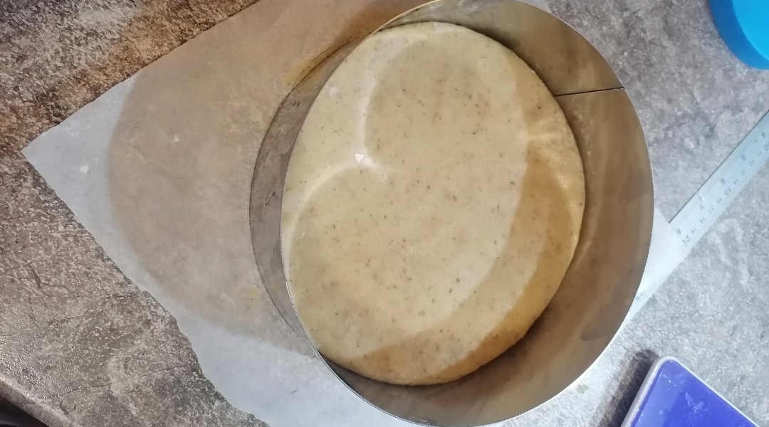подпыляя мукой, до размера формы, у меня круг d 18 см. Отправить в