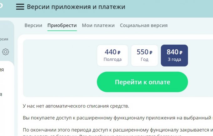 Надо открыть полное меню слева (жмите на троеточие), и предпоследняя строчка "Версии/оплата"