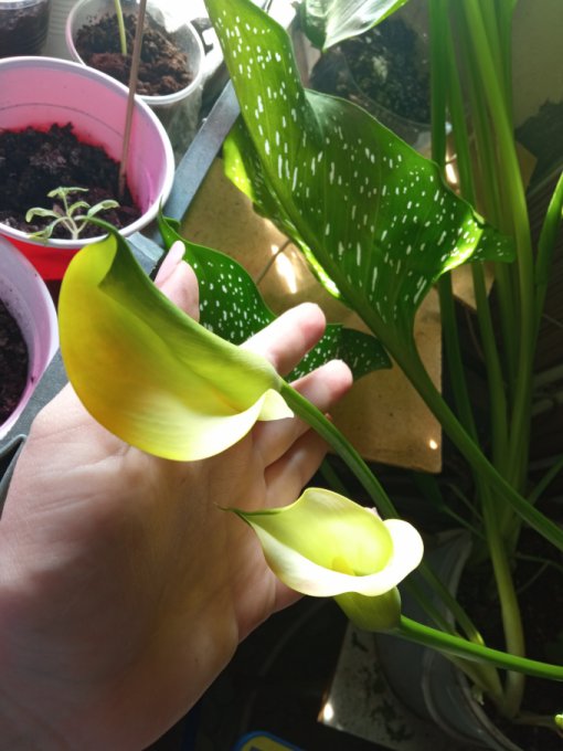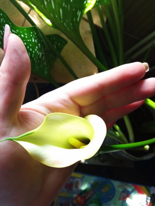Ещё хотела показать мою любимицу зеленую- каллу. Первый год она у меня так шикарно цвела не переставая несколько месяцев, цветов было море, жаль не сфоткала. А последние 2года она меня не радовала. Пускала по 1"цветку" и все☹️. В этом году пробую другой метод выращивания, может он даст большего результата🤷