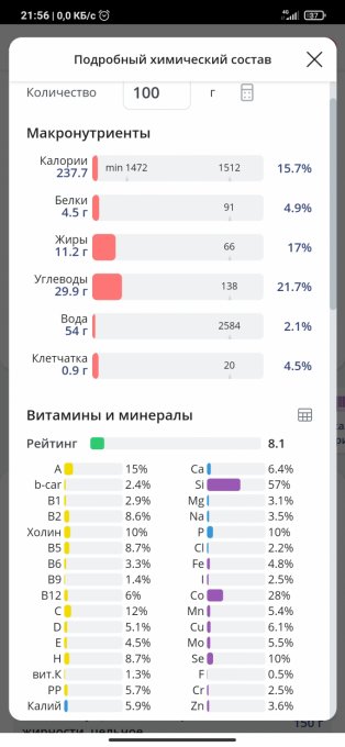 | Кол-во | Калории | Белки | Жиры | Углеводы | |
