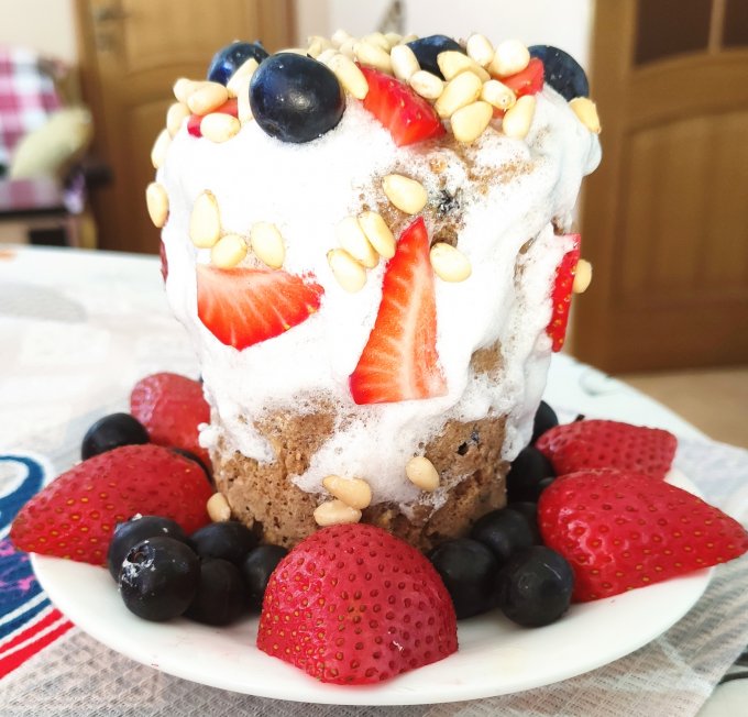 Кулич на эритрите и цельнозерновой муке. С пряностями, вяленой клюквой, черносливом и кедровыми орешками. Глазурь - взбитый с эритритом и лимонным соком яичный белок. Украшен ягодами и орешками. Вкусно!