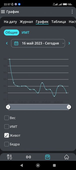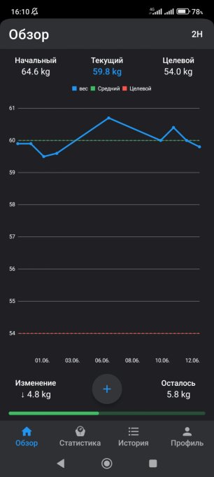 13 июня: вес - 59.8 бедра - 95, живот - 80