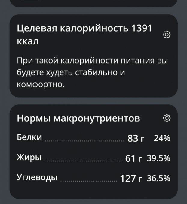 Сегодня в рацион даже клетчатку добавлять не пришлось😁 Жиры было сложно набрать, но я это сделала 💪 Завтра куча дел. Не успею потренить дома с гантелями 🥺 Буду тренить в среду))