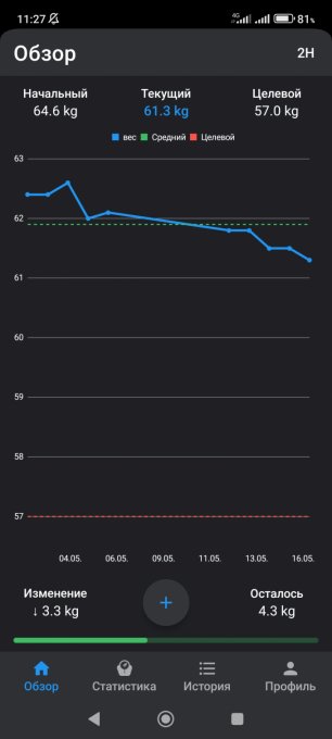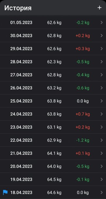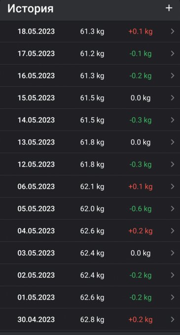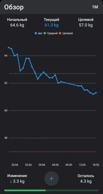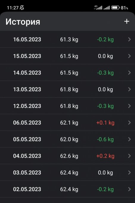 -1.1 за две недели (2.05 - 16.05.) В объемах особо ничего не изменилось (по сантиметру, поэтому выкладывать не буду), а вот визуально (фото не будет 😂) изменения есть 😎. Появилась бороздка на животе😍 Кайф)). Не знаю, хороший ли результат за две недели, но в четверг будет результат за месяц!! Вот там поинтереснее))