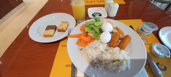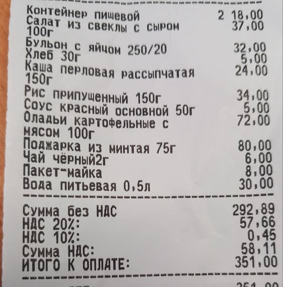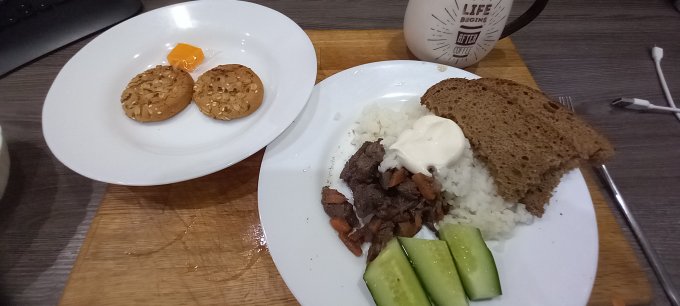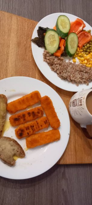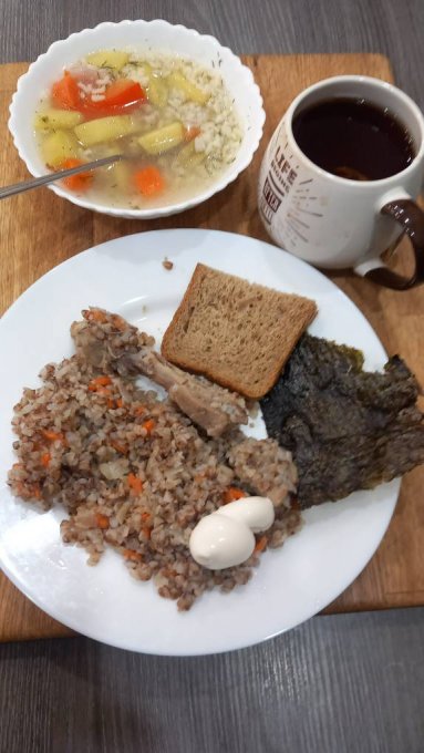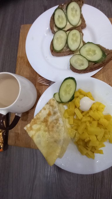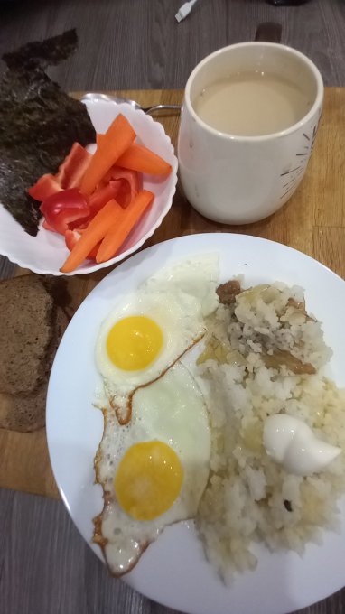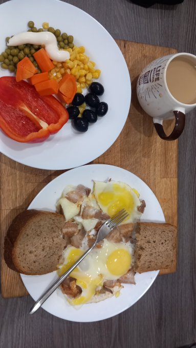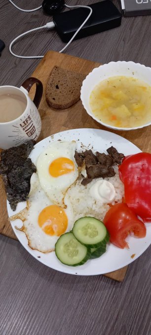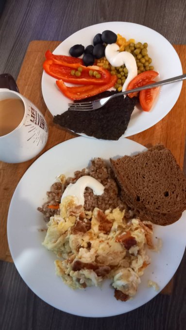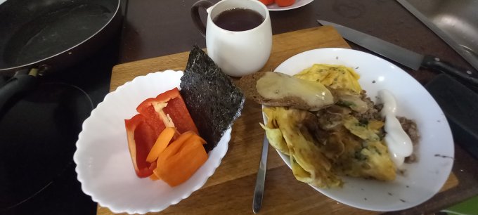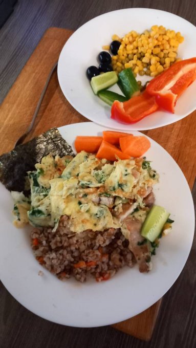 Завтрак- гречка, омлет с беконом, овощи- горошек и кукуруза перец и оливки , нори, хлеб и кофе с молоком.