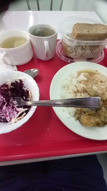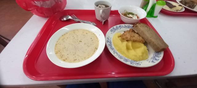 Бульон с яйцом, рис и поджарка с минтая, салат со свеклой.