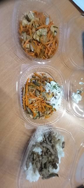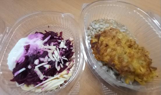 Перловка и картофельные оладья с мясом, салат со свеклой.