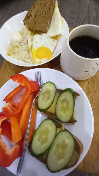 Яйцо с грудинкой и шпинатом, овощи: перец ,морковь и морская капуста.Из углеводов гречка. Чай с хлебом и сыром.