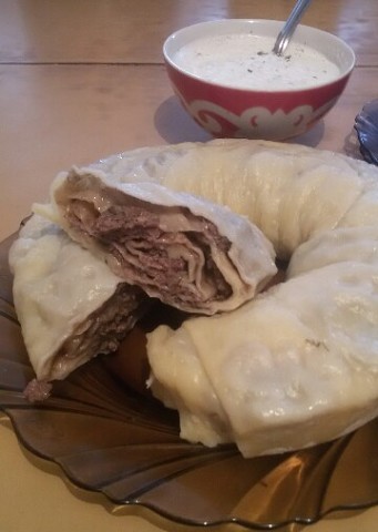 начинка: фарш говяжий 500 гр+ соль+перец+30 воды