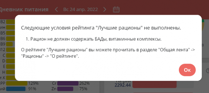 Написано, что рацион не вошел в рейтинг, потому что в моем рационе присутствуют БАДы и витаминные добавки, хотя у меня даже в доме ничего подобного нет, и в рационе исключительно натуральные продукты, преимущественно собственного приготовления.