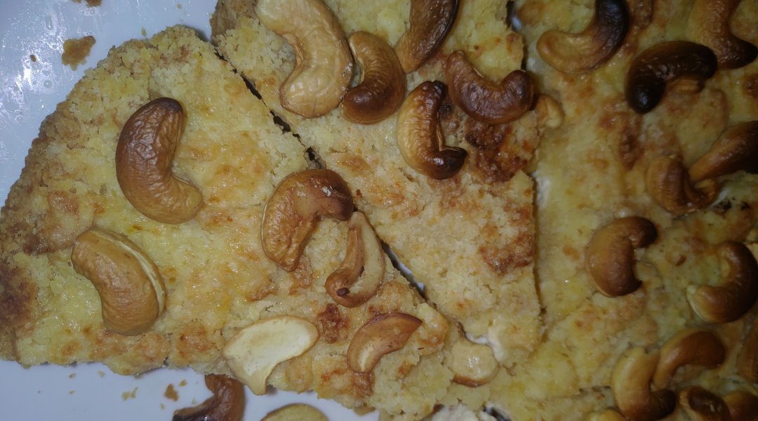 На промасленную бумагу выложить 2/3 смеси муки с маслом и сформировать дно пирога и бортики. Вылить творожную начинку. Сверху присыпать оставшейся смесью и украсить орехами.