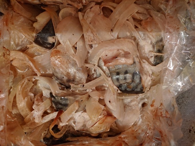 Запекла скумбрию в рукаве со сметаной и луком. Очень вкусно.