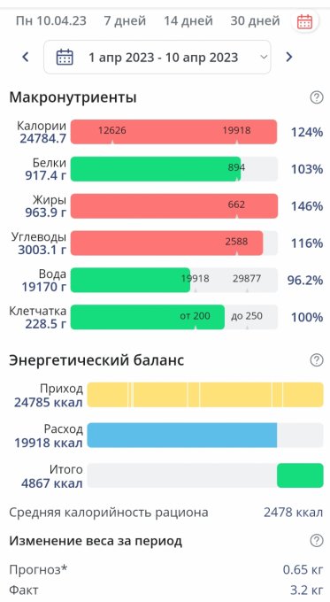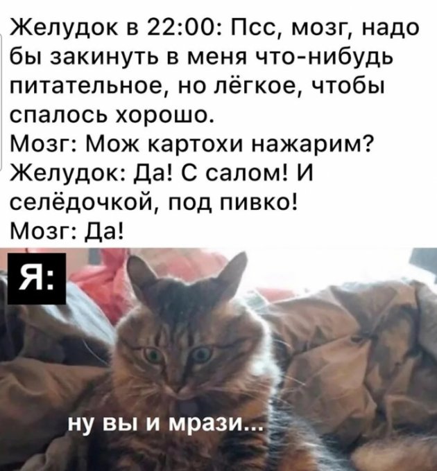 По колориям - полет нормальный. На быстрые угли в течении дня крышу не рвёт🙂 А вечером... В очередной раз убеждаюсь что ужинать нужно раньше. Примерно в 18-19. И не потому что Британские учёные доказали что так худеется лучше, желудку полезнее и пр. А потому что организм в спячку готовится уходить. Ну и что? - спросите вы. Не знаю что. Только догадываюсь. Поужинать нужно за 2-3 часа до того как ночной жор проснётся, иначе ужин плавно переходит в ночной дожор🤪