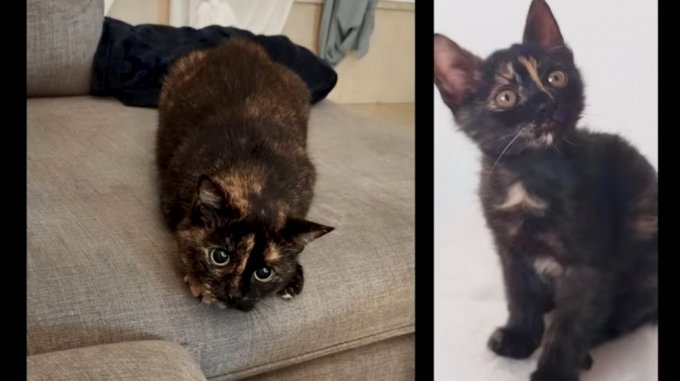 Милое создание с черепаховым окрасом обрело новых хозяев и принесло им счастье: кошечку точно такого же окраса забрала в другой город повзрослевшая дочь, а родители остались без пушистой любимицы. Сравните🙂