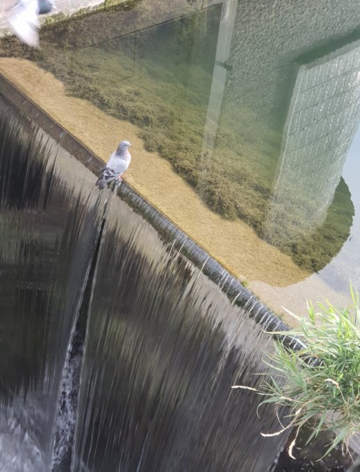 Голубь на краю водопада на дамбе. Их штук 5 сидело и барахталось в воде, не успела снять)