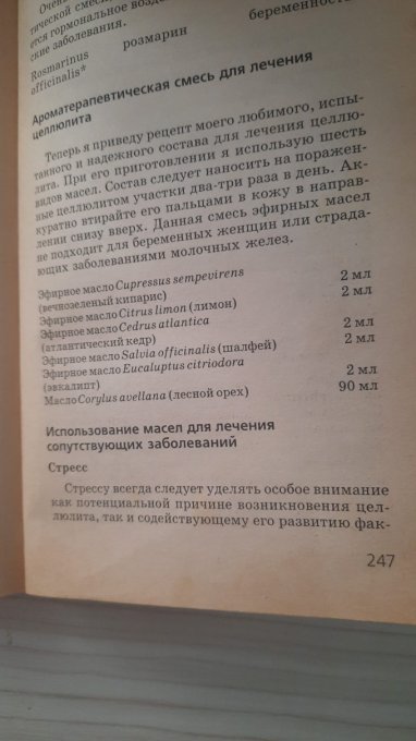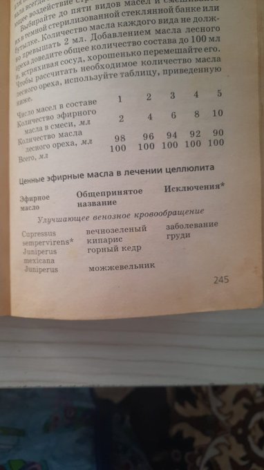 по 2 гр ароматиических масел, розмарин, апельсин, лаванда, и еще два любых на выбор, это по рецепту. Я добавляла по пару капель витаминов А и Е от себя.