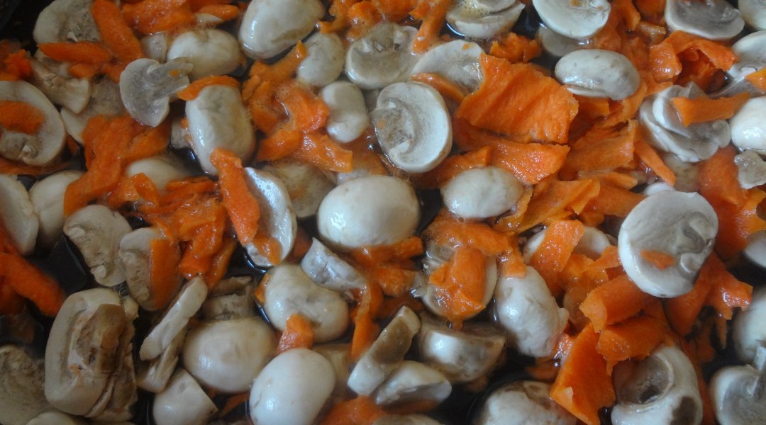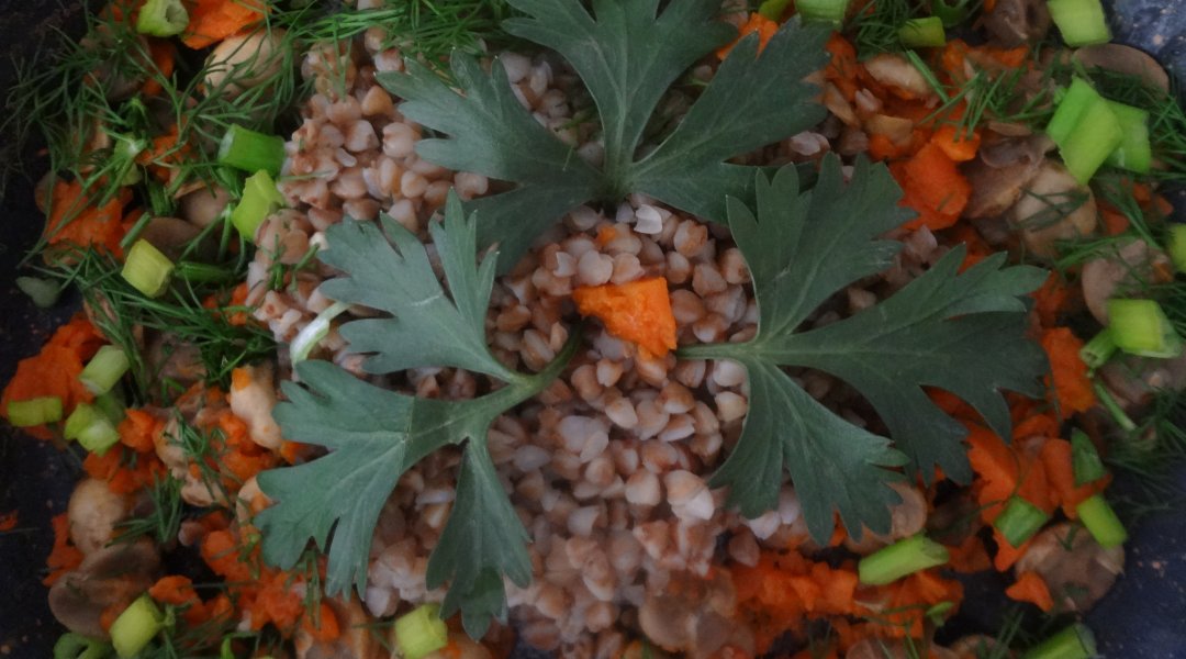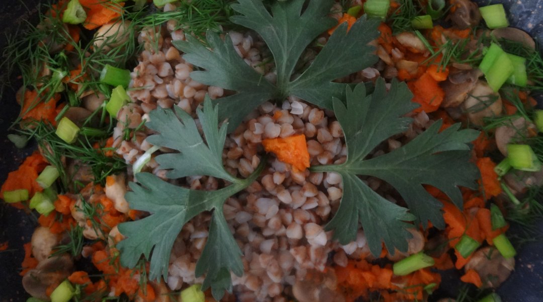 Шампиньоны помыла, почистила, морковь натёрла на крупной тёрке, залила водицей и припустила до готовности, слегка посолила. Гречку промыла, залила водицей, посолила и отварила до готовности. Готовую гречку выложила в шампиньоны с морковью и посыпала нарезанными: петрушкой, укропом и зелёным лучком.