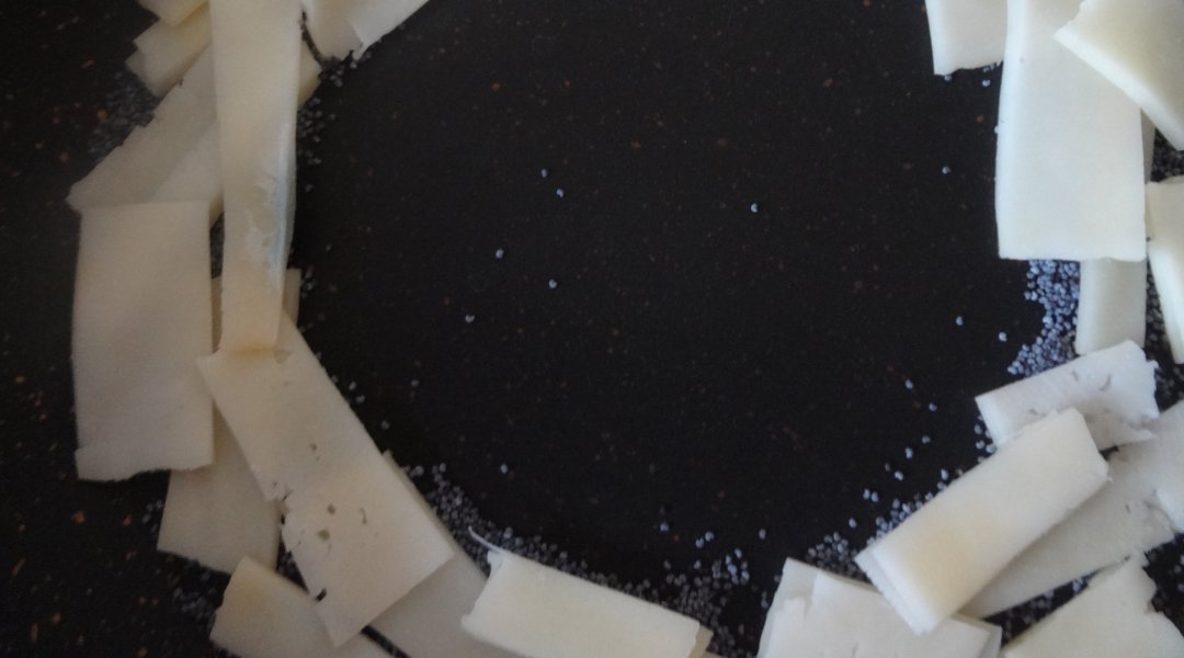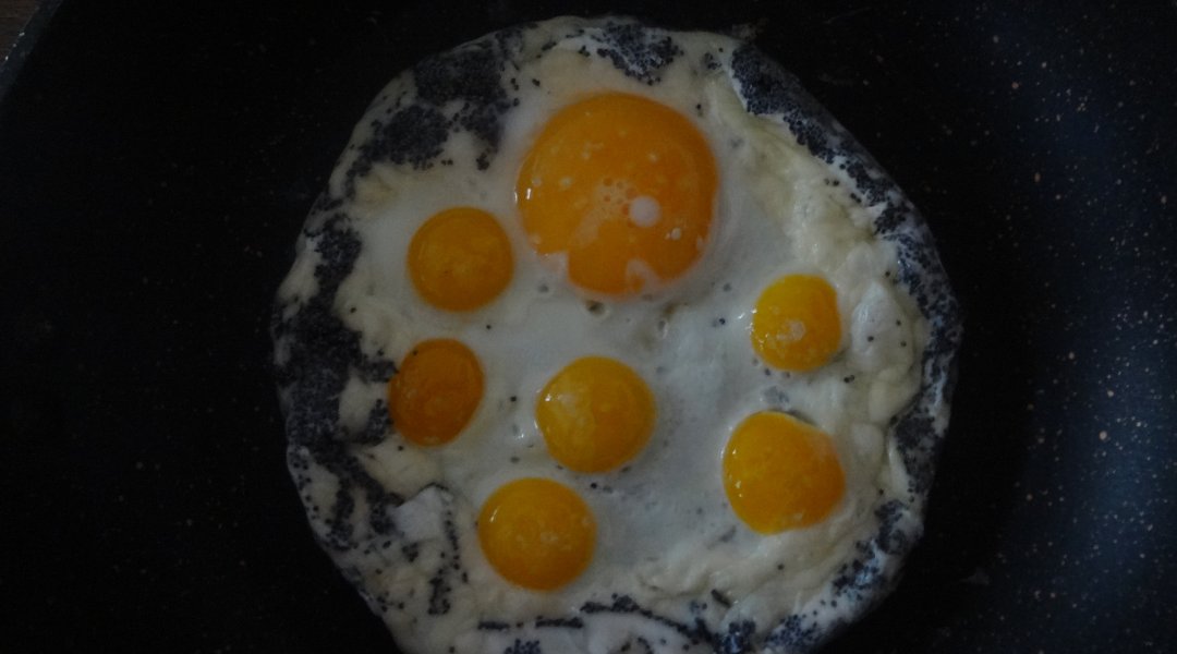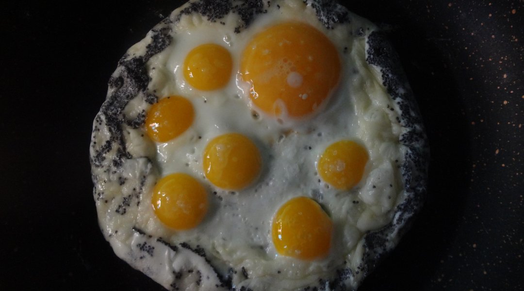 Мак насыпала вокруг бортиков сковороды, внутри смазала кокосовым маслицем, разбила внутрь круга куриное и перепелиное яйцо. Мак и сыр вкладывала на холодную сковороду. Затем сковороду включила на 7- градусов и разбила в центр яички. Слегка посолила желтки, можно и не солить, за счёт сыра блюдо солёное. Жарила при 120 градусах минуты две три, края с сыром и маком лопаткой загнула на яичницу. Блюдо за счёт сыра высококалорийное, худеющим с осторожностью.