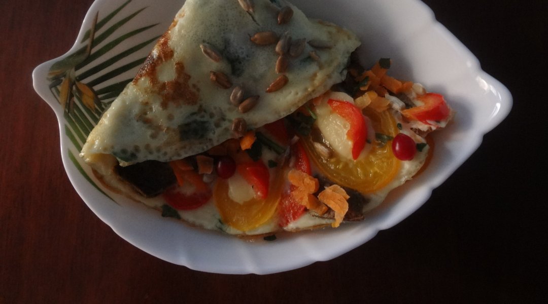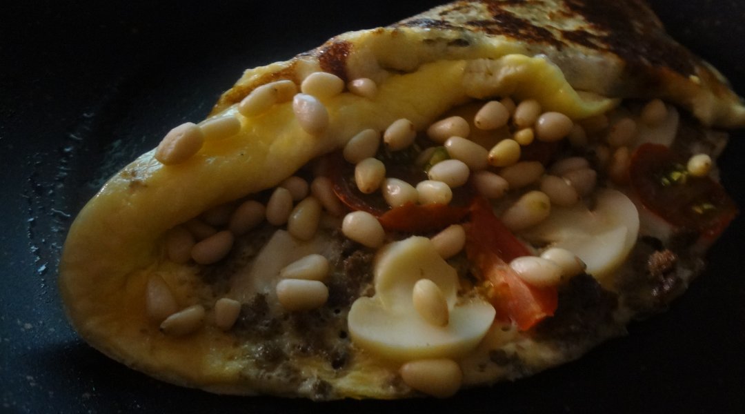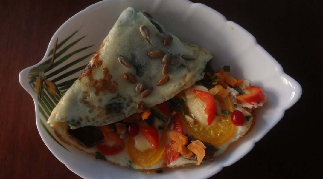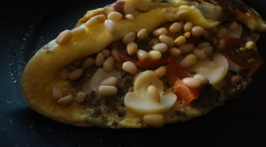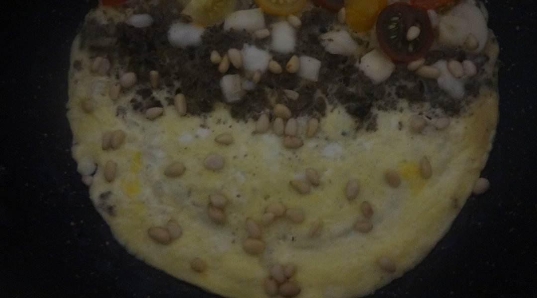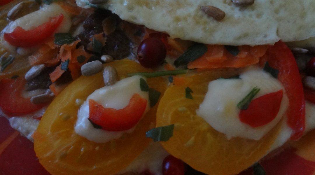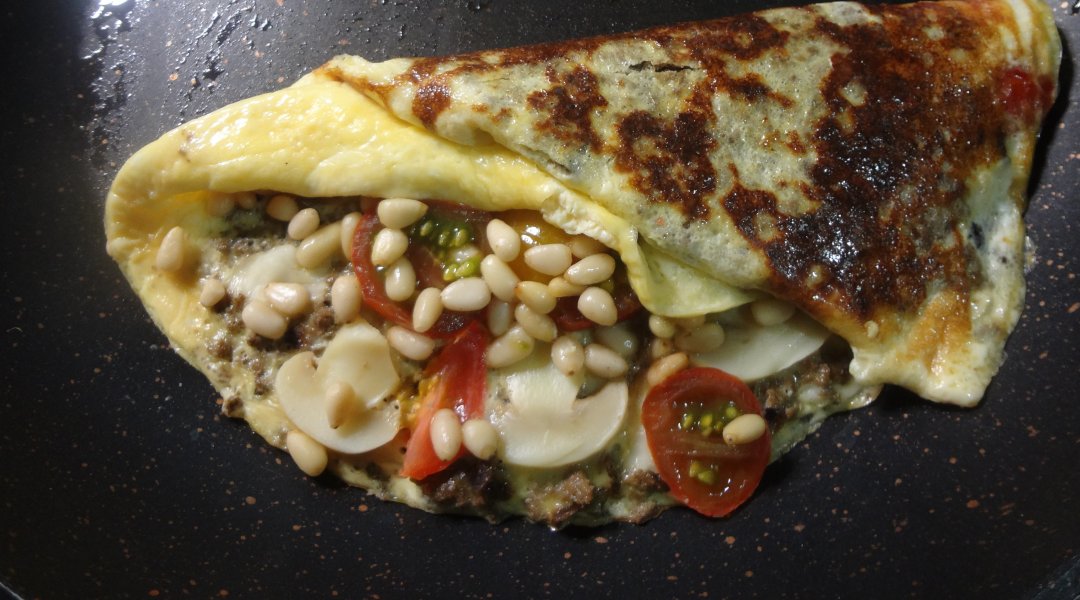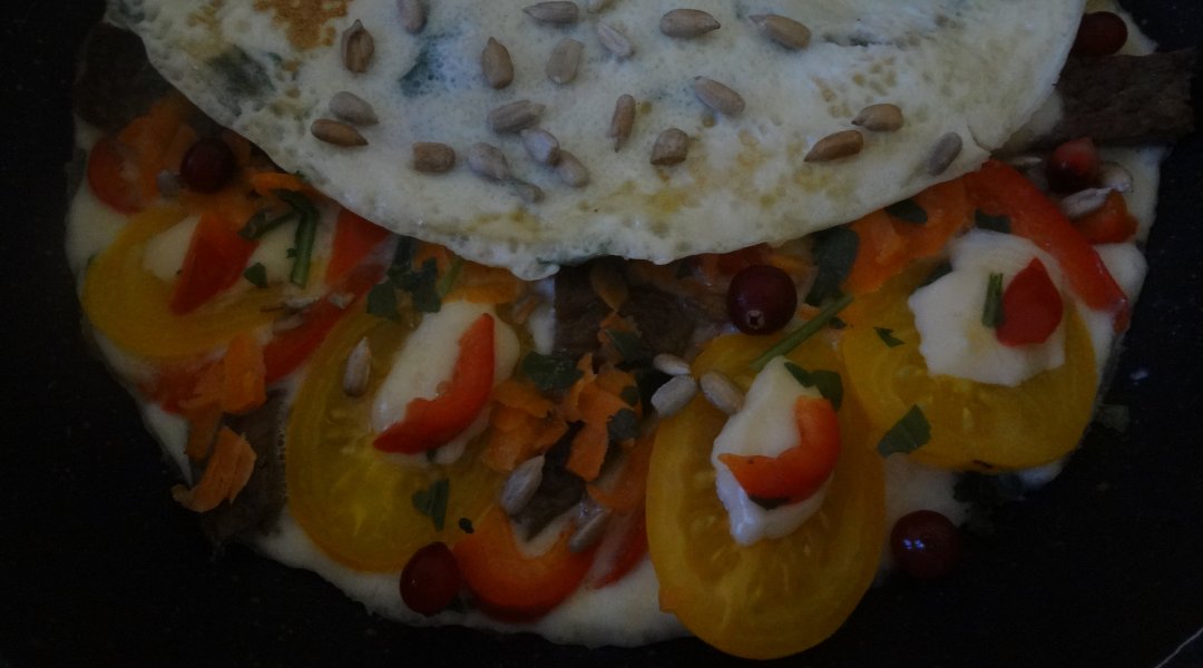 Сковородочку тефлоновую нагрела до 70 градусов в это время . Яйцо взбила с сывороткой, посолила, вылила на неё омлетную массу. Затем натёрла на крупной тёрочке блинчик из говяжьей печени, выложила на омлетную массу, туда же сыр, помидорки черри, кедровые орешки. Включила плиту на 120 градусов, когда блинчик поджарился, половинку с начинкой закрыла второй половинкой.