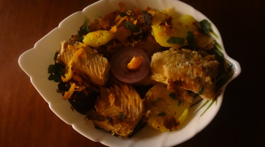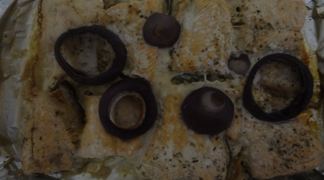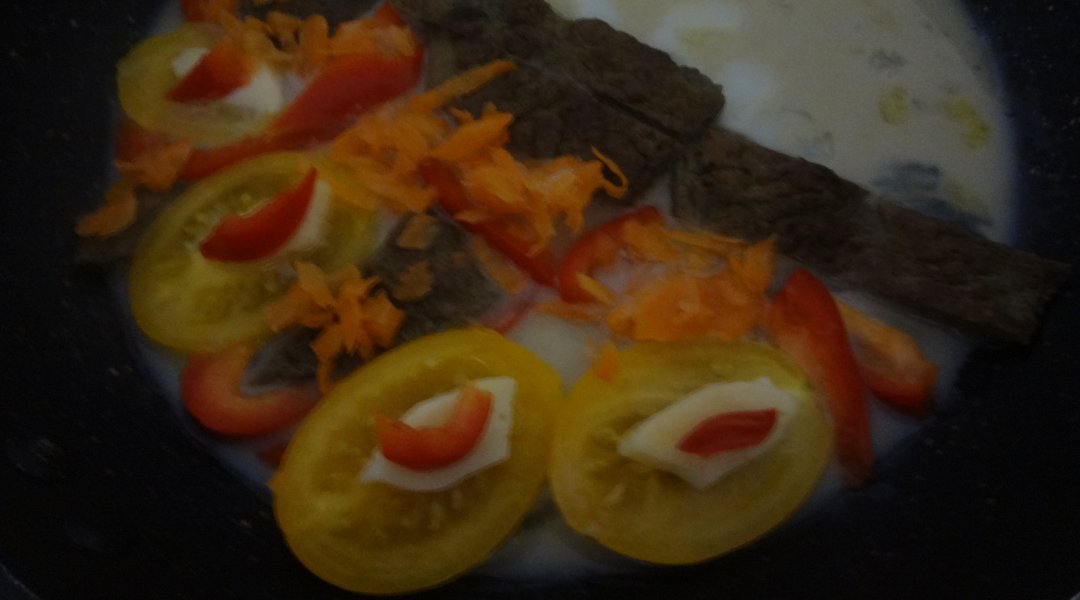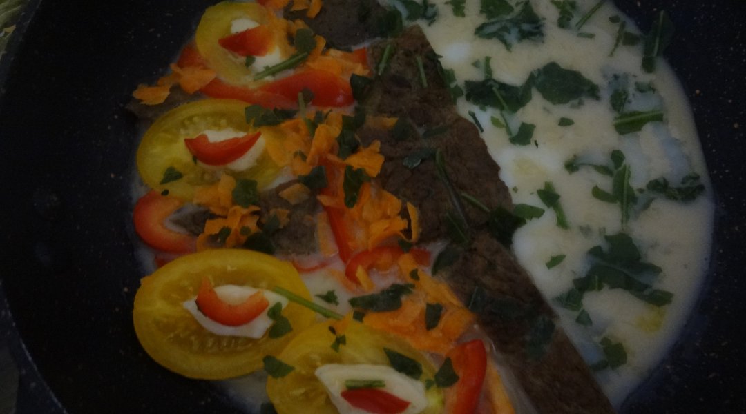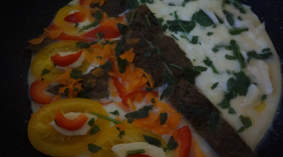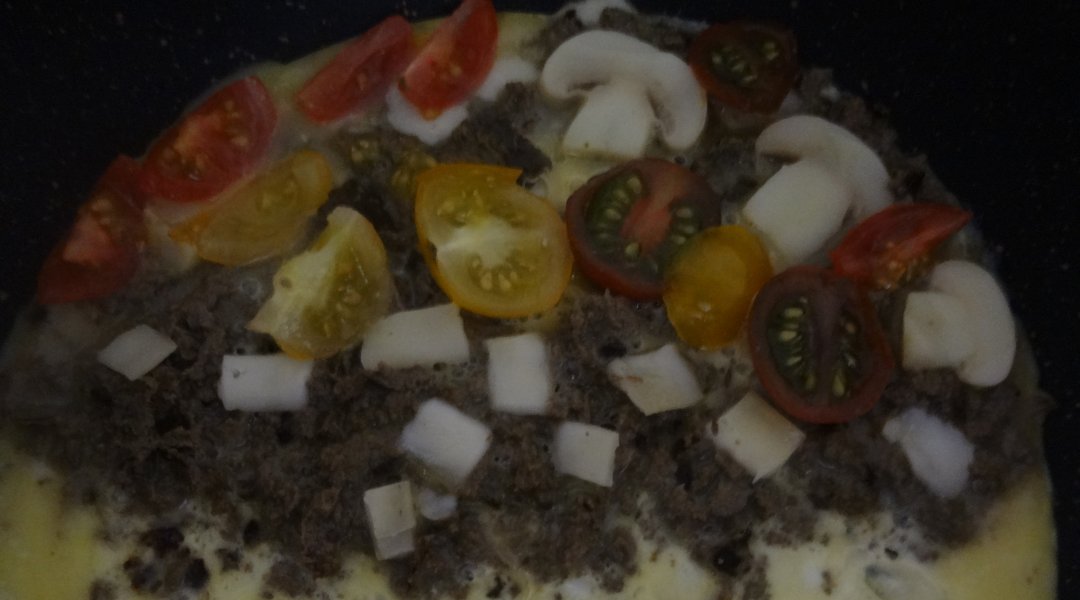 Приготовила омлетную массу из яиц и молока, посолила по вкусу, вылила на смазанную кокосовым маслицем тефлоновую сковороду, выложила на омлетную массу, все ингредиенты жарила от 70 до 120 градусах 10 минут