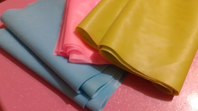 Случайно когда то купила в магазине резиновые ленты. Яркие, красивые отлично тянутся. Разная степень тянучести, легче, труднее ещё труднее. Удивительно, но прижились. Занимаюсь с ними каждый день.