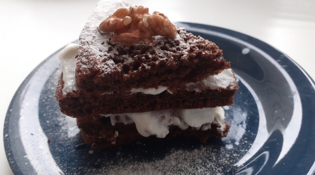 Разогрела антипригарную сковородку, смазала небольшим количеством масла и выпекала оладьи на среднем огне (с одной стороны около 4 мин, с другой - 1 мин.). Получилось две оладушки. Оладушки разрезала на 4 части каждую. Из 4 треугольничков составила пироженку, смазав поверхность греческий йогуртом с клубникой. Украсила сахарной пудрой и грецким орешком. Вторую оладушку можно просто скушать или составить ещё одно пирожное.