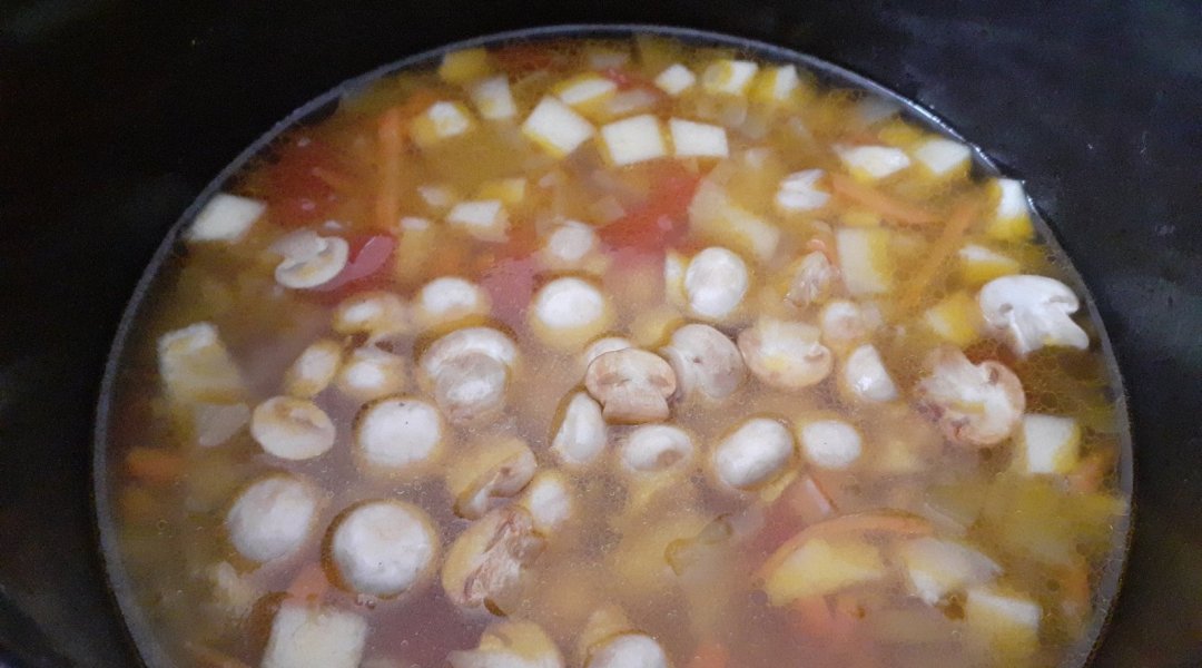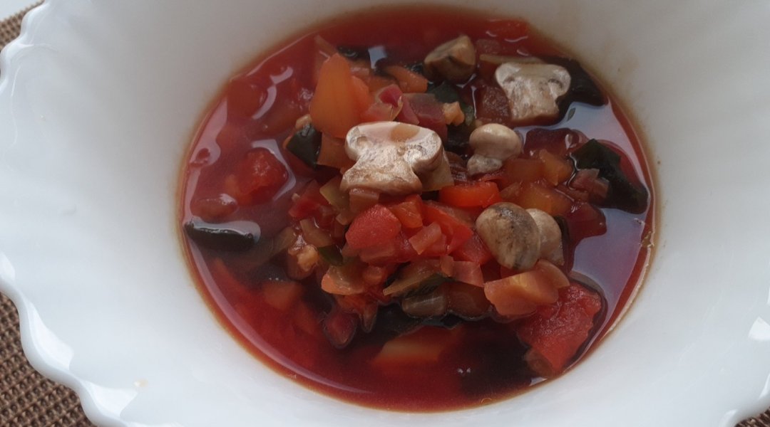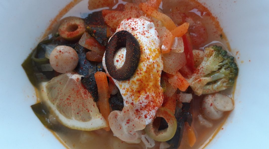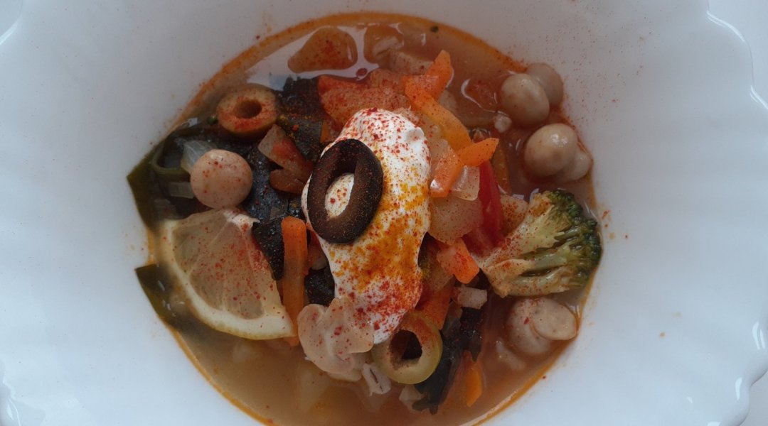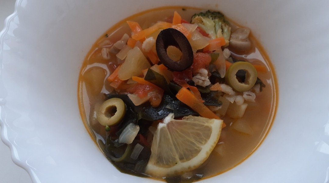 Перловку взвесила, помыла, залила водицей поставила на плиту вариться. Овощи, почистила, помыла, порезала. На тефлоновую сковороду налила оливкового маслица и приготовила зажарку из лука, моркови и помидорки. Зажарку и приготовленные овощи, водоросли вакамэ, высыпала в кастрюлю вариться. Помыла и порезала шампиньоны. Поджарила их до выделения воды, когда вода испарилась, отправила в суп. В готовый супчик добавила маслин с оливками, дольки лимона, греческий йогурт..