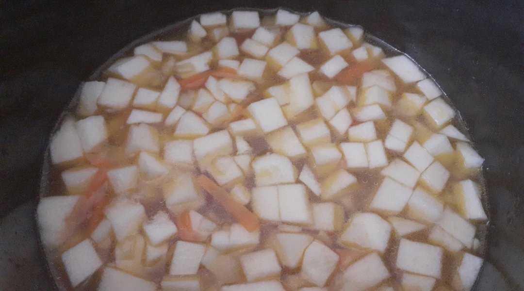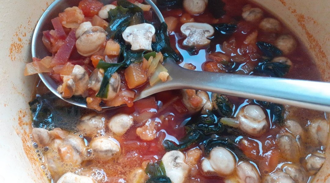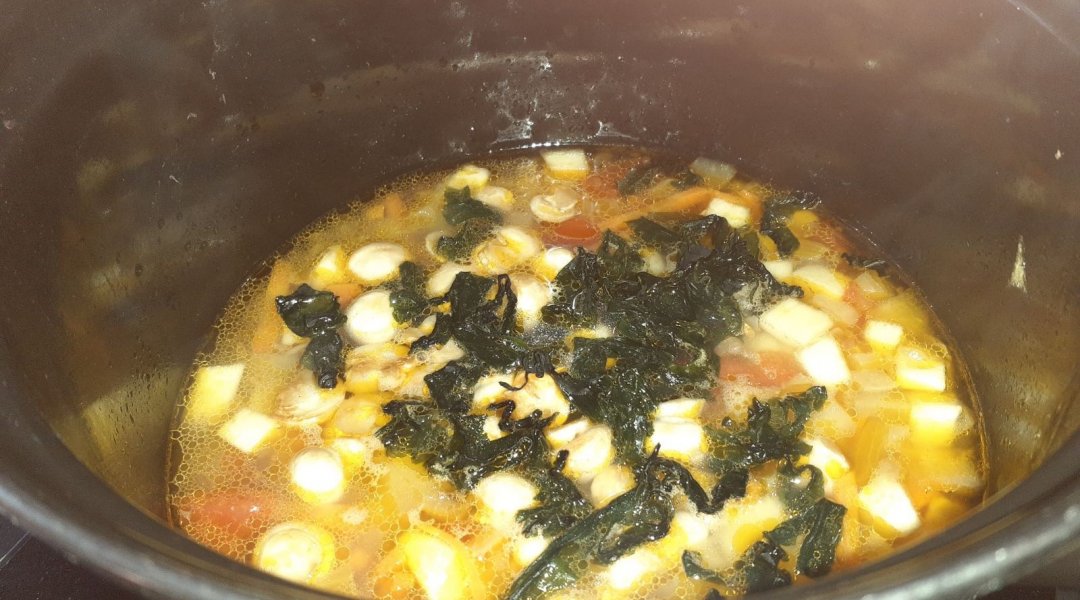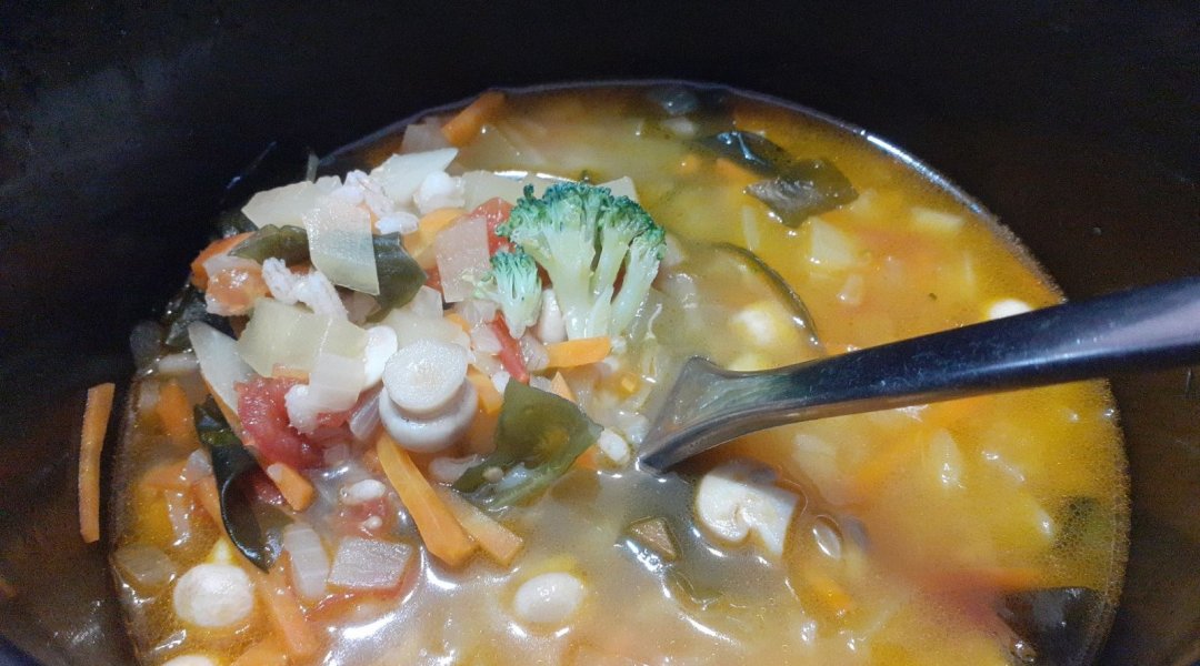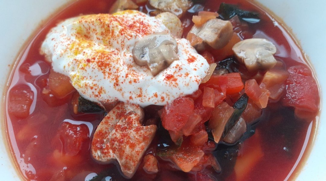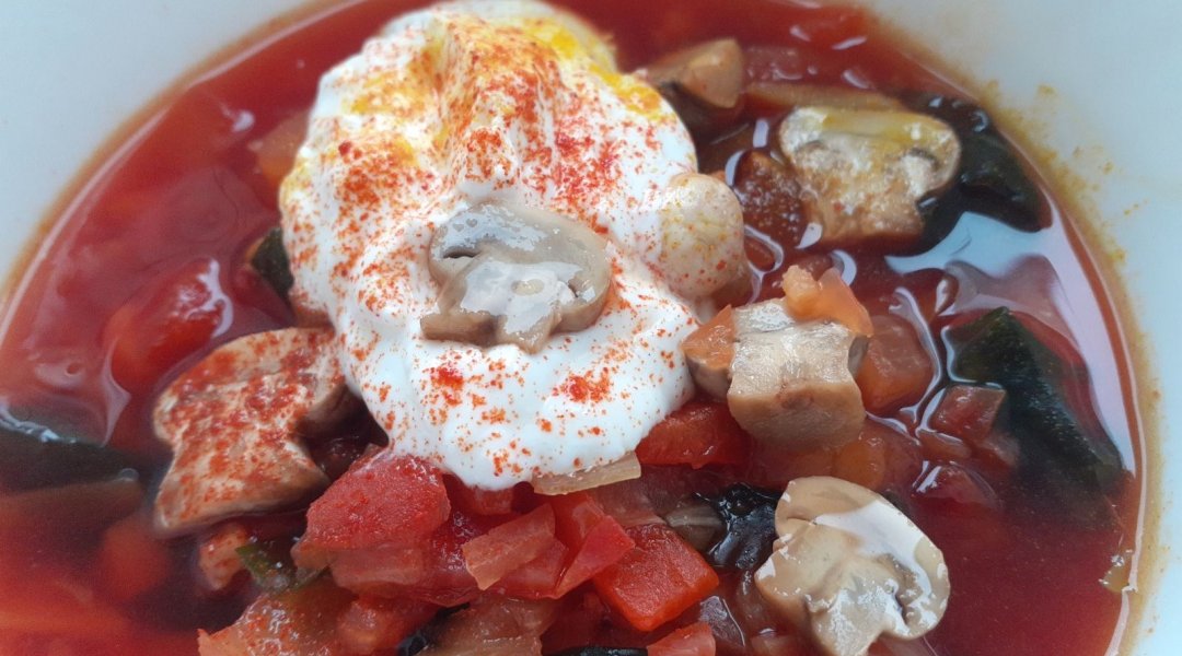 Перловку взвесила, помыла, залила водицей поставила на плиту вариться. Овощи, почистила, помыла, порезала. На тефлоновую сковороду налила оливкового маслица и приготовила зажарку из лука, моркови и помидорки. Зажарку и приготовленные овощи, водоросли вакамэ, высыпала в кастрюлю вариться. Помыла и порезала шампиньоны. Поджарила их до выделения воды, когда вода испарилась, отправила в суп. В готовый супчик добавила маслин с оливками, дольки лимона, греческий йогурт..