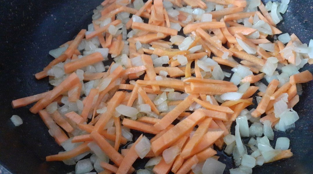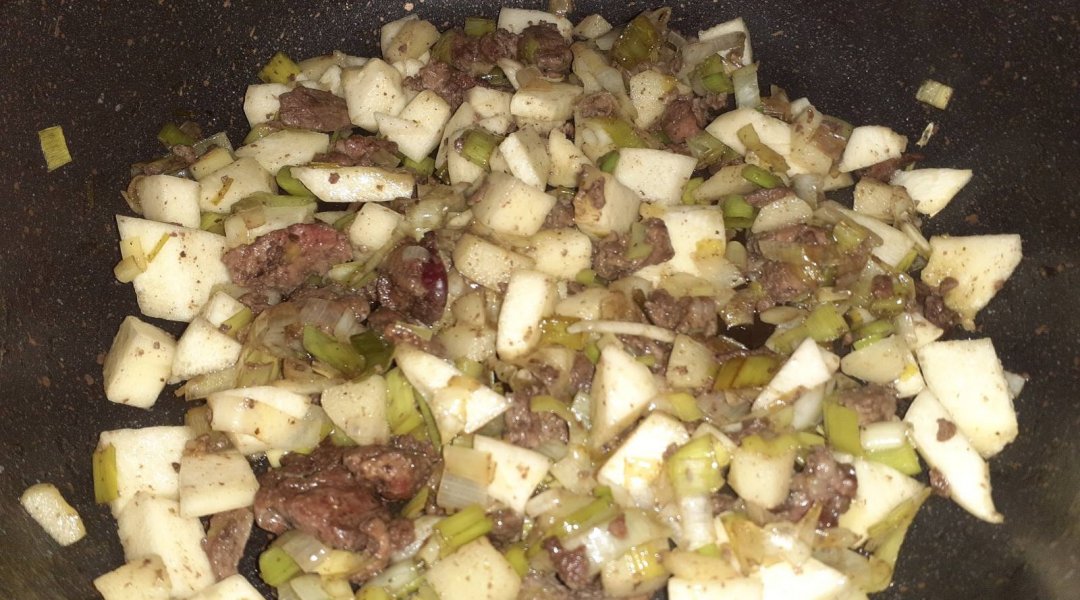 Печень цыплёнка с луком пореем,, кабачком, ламинарией
