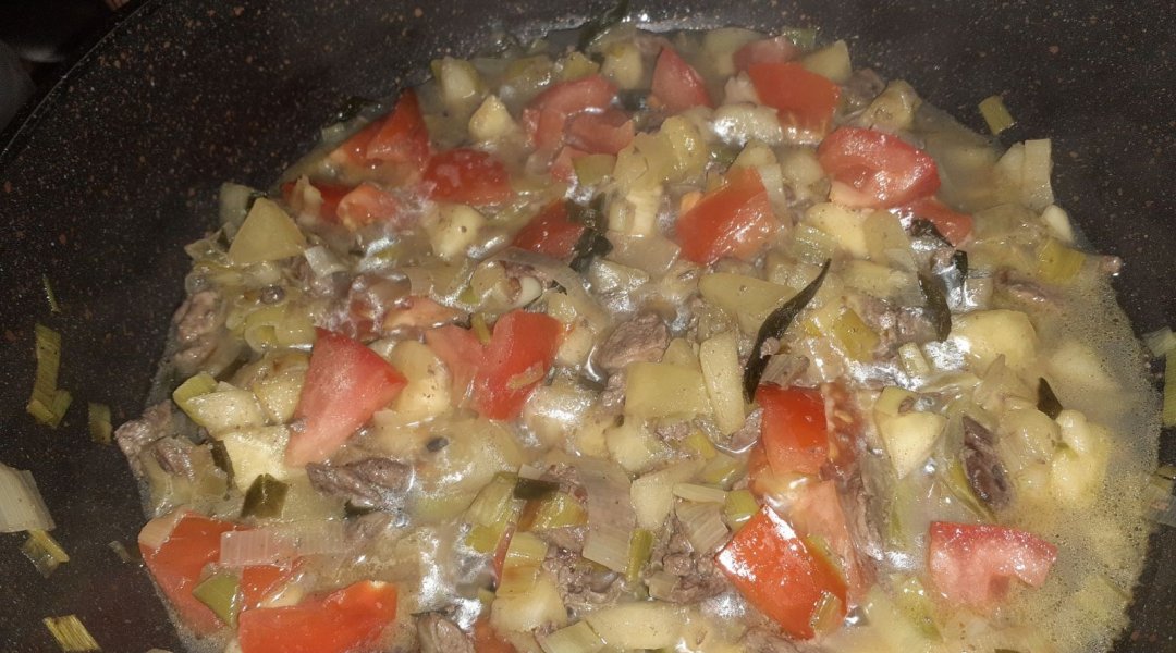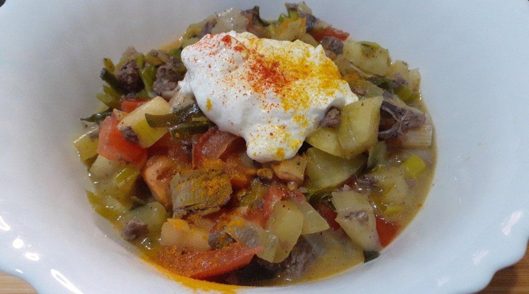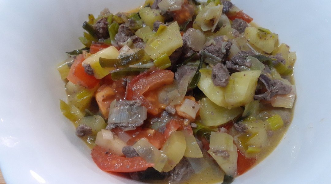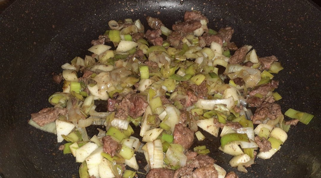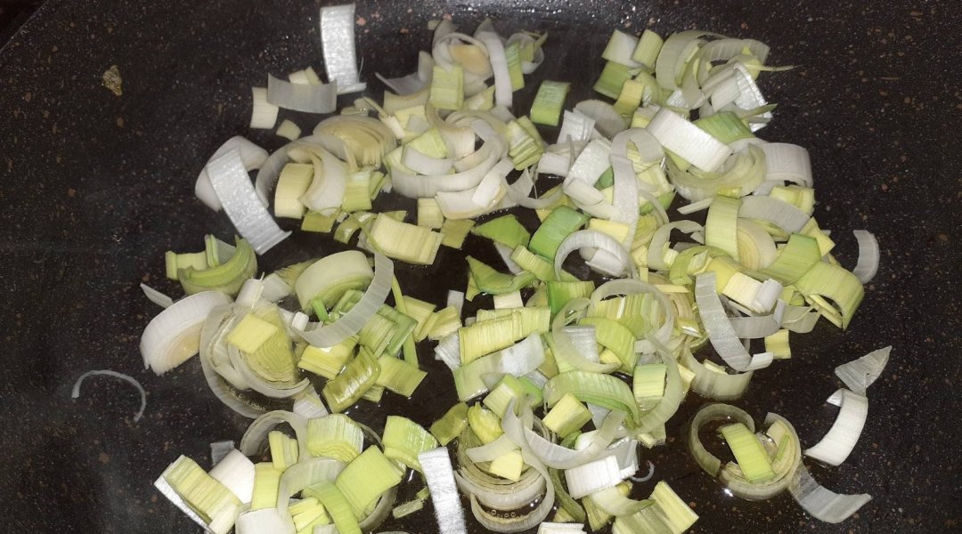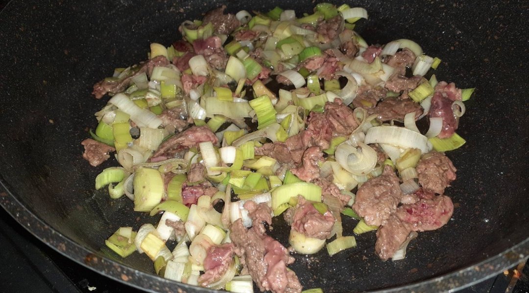 Лук порей почистила, помыла, порезала, поджарила на тефлоновой сковороде на оливковом маслице до прозрачности. Добавила печень и остальные ингредиенты и тушила ещё 20 минут. Посолила по вкусу, добавила любимых специй и греческий йогурт.