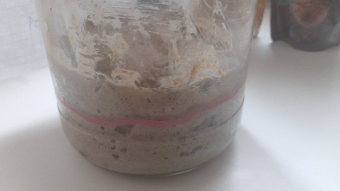 Второй день, продолжаю учиться готовить закваску для ржаного теста. Закваска поднялась, видно по очерченной линии. Теперь 7 дней буду её кормить каждые 12 часов.=))