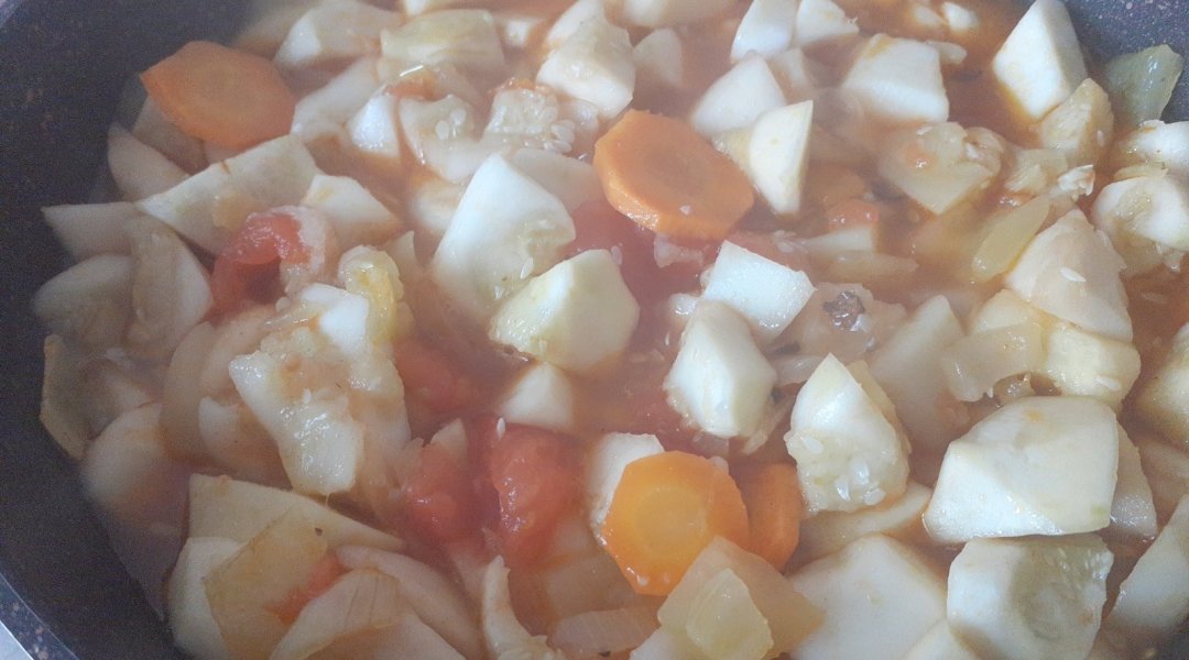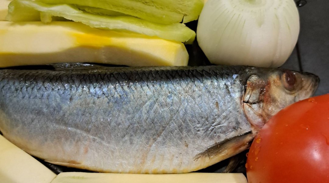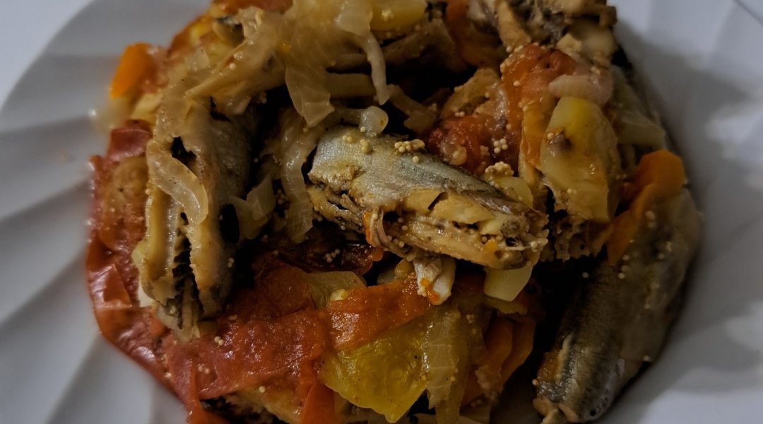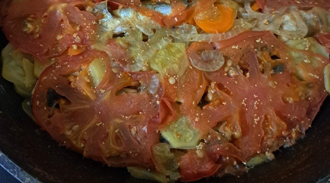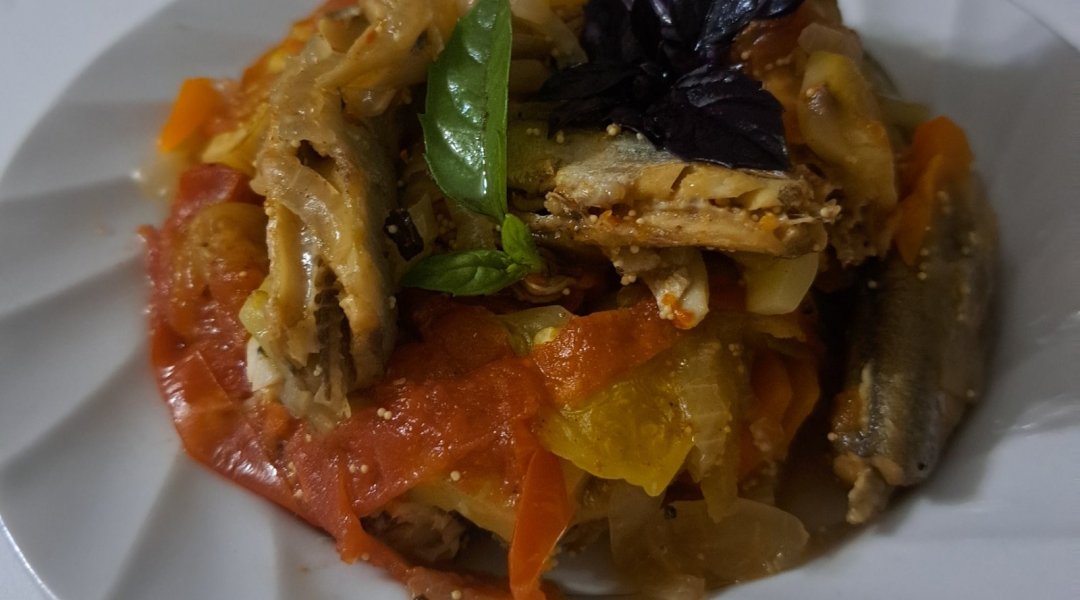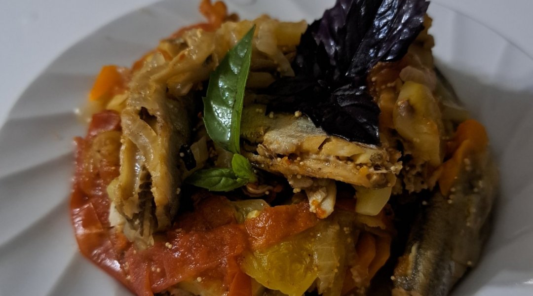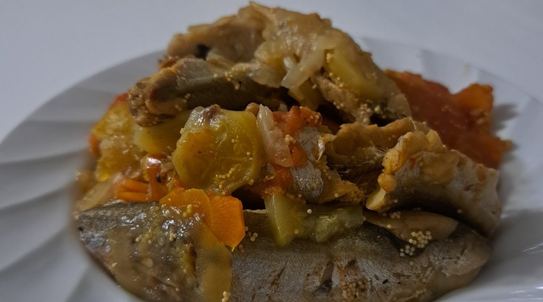 | Мойва тушёная с кабачком, луком, морковью, сладким перцем |