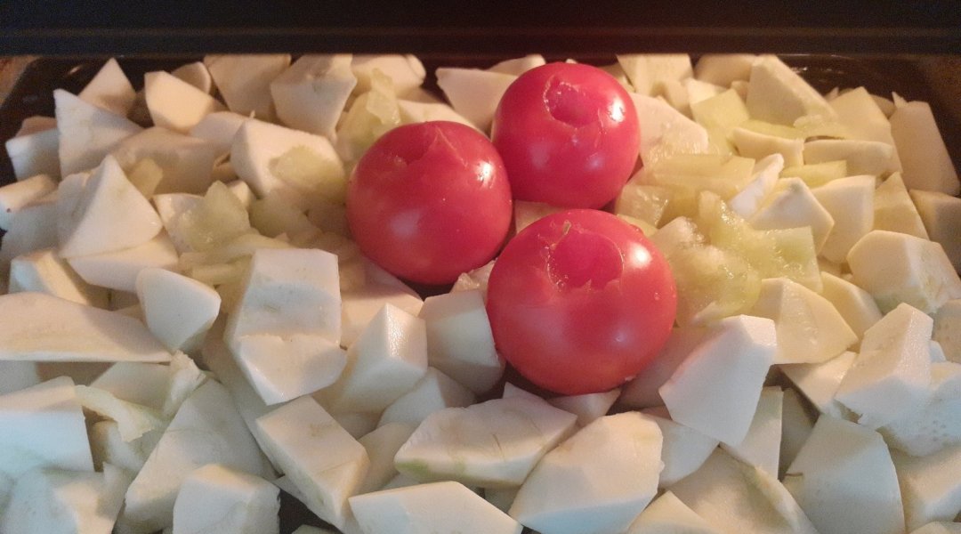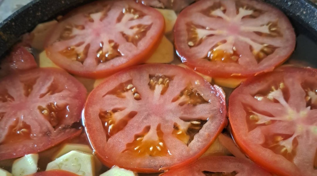 | Кабачки запечённые с помидорами и сладким перцем с жареными луком и морковью |