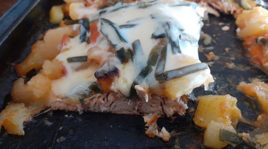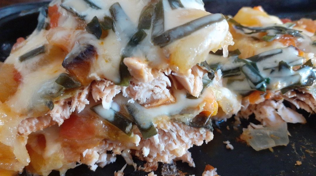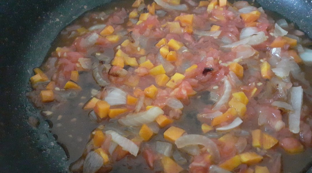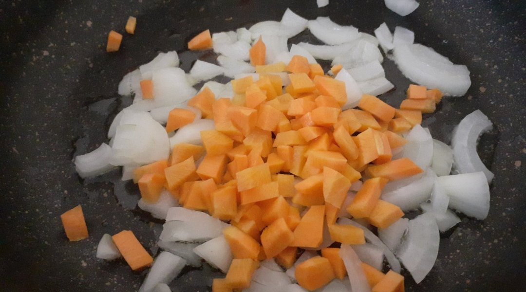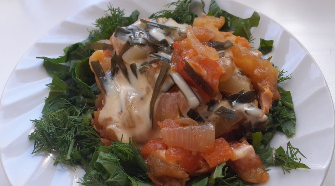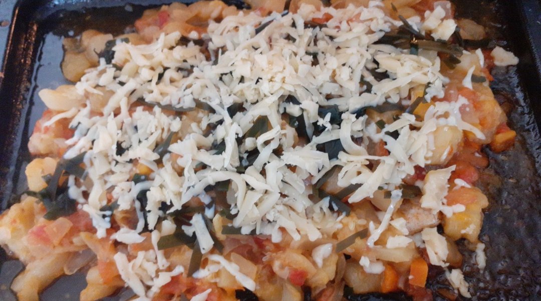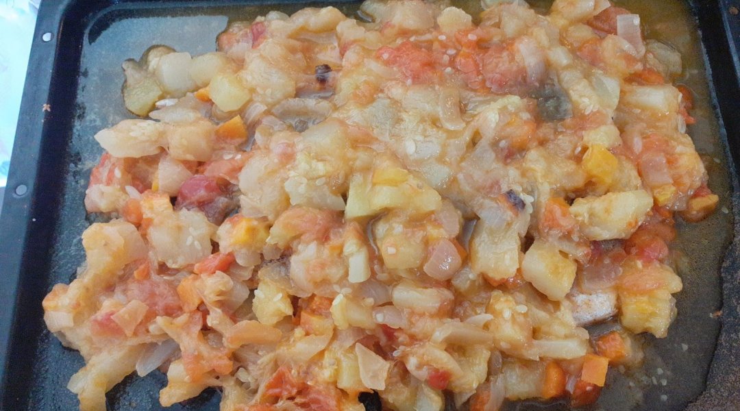 | Кабачки запечённые с помидорами и сладким перцем с жареными луком и морковью |