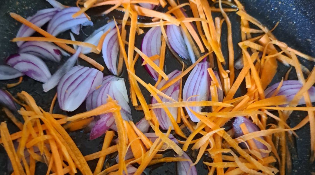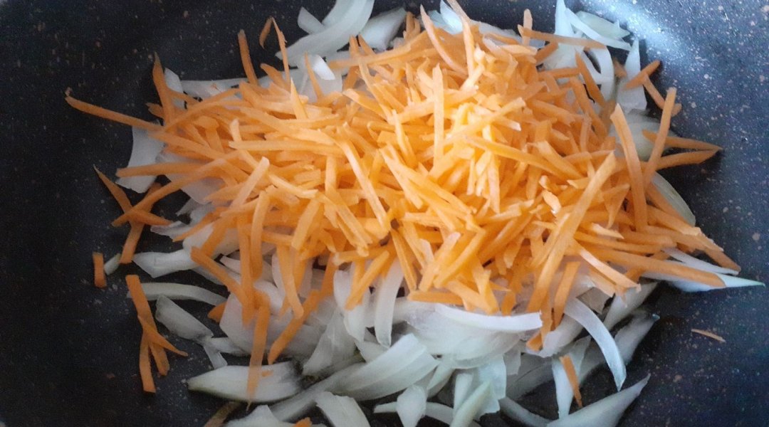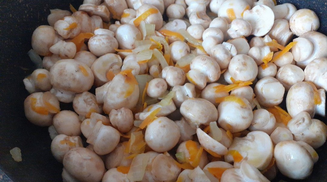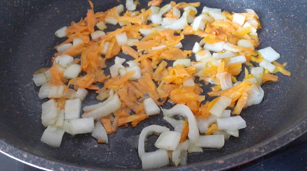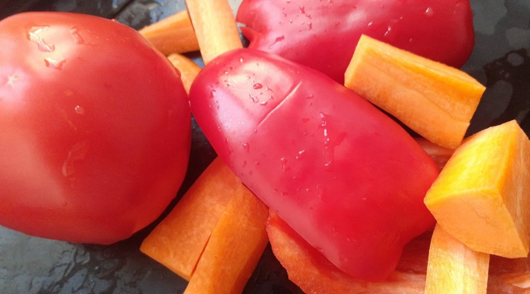 | Кабачки запечённые с помидорами и сладким перцем с жареными луком и морковью |