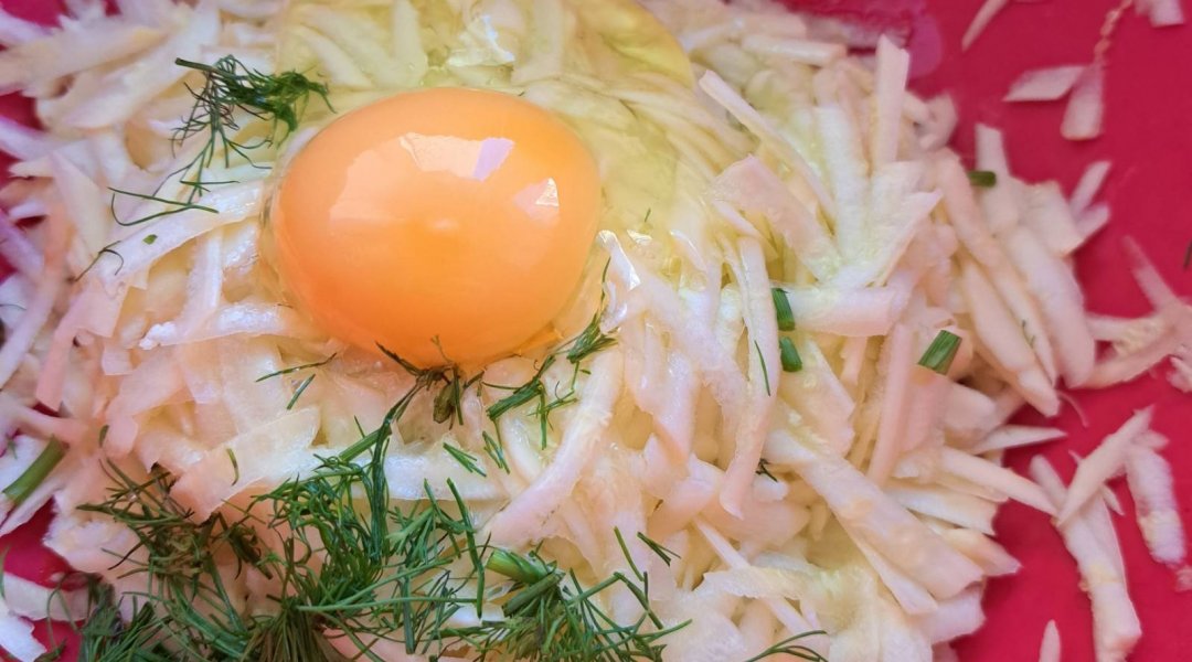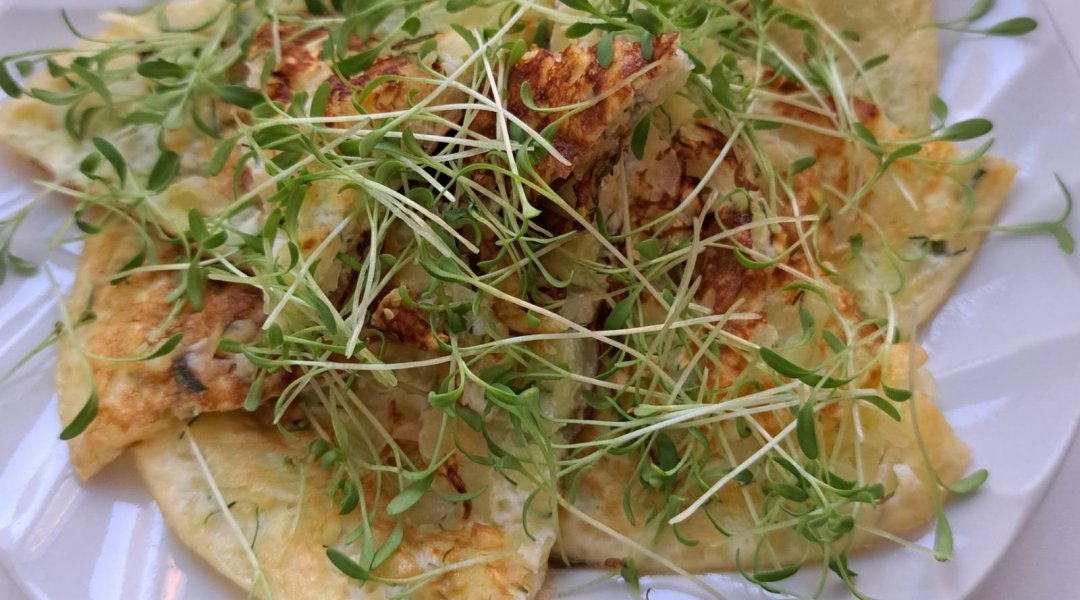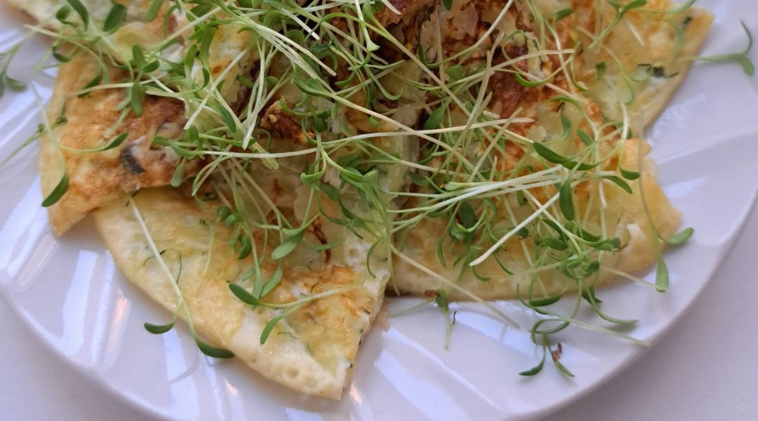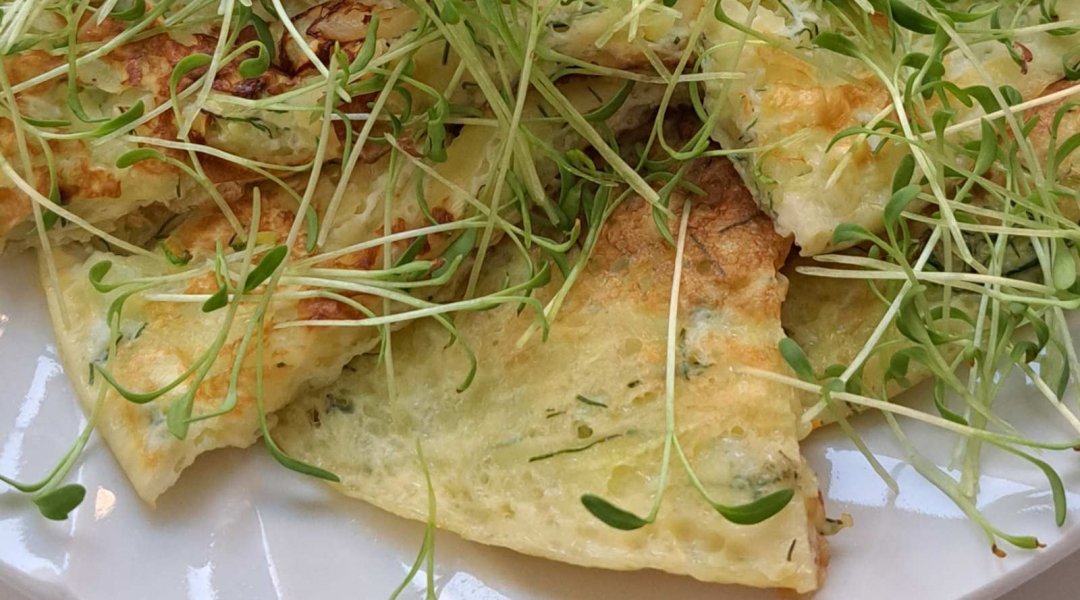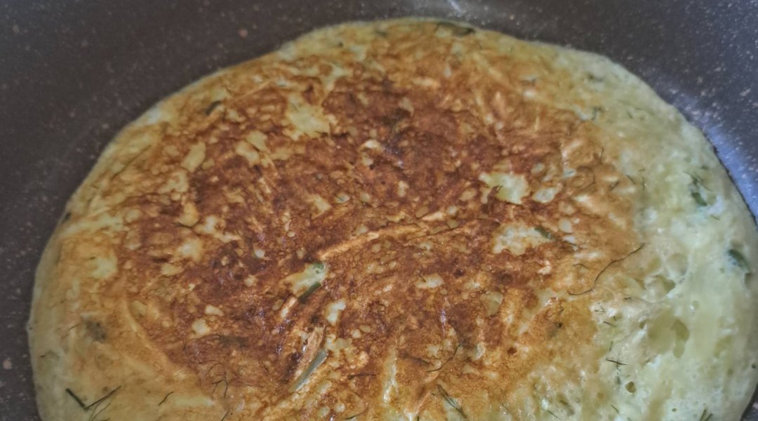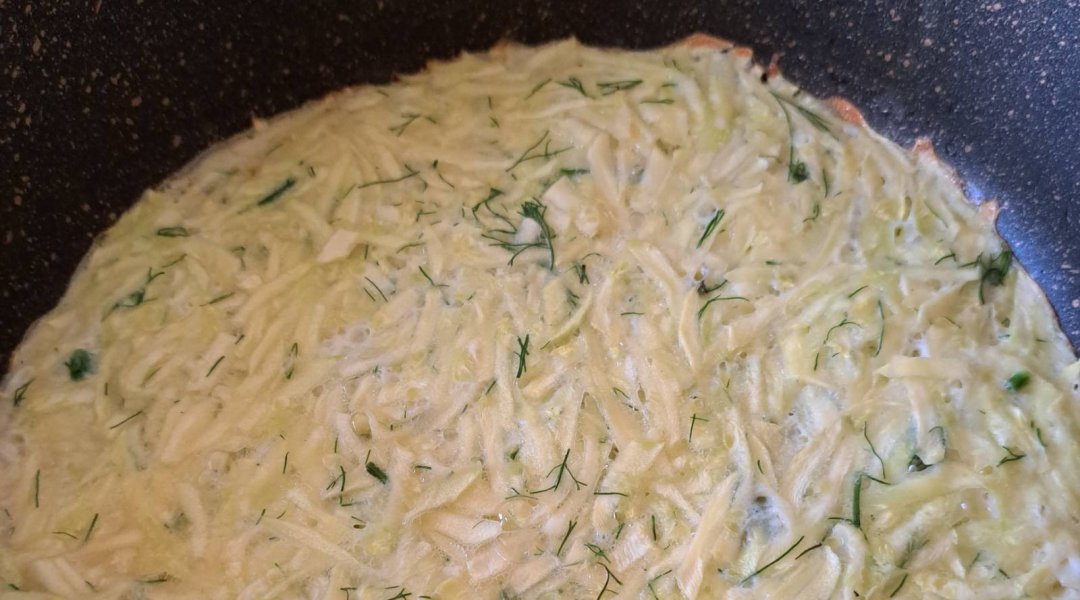 Кабачок молоденький помыла, почистила, натерла на крупной тёрочке, добавила куриное яичко, помытый и мелко порезанный укропчик, посолила по вкусу. Жарила на тефлоновой сковородочке, смазанной оливковым маслицем с двух сторон. Переворачивала с помощью большой тарелки. Порезала на треугольнички . Украсила микро зеленью кресс салата.