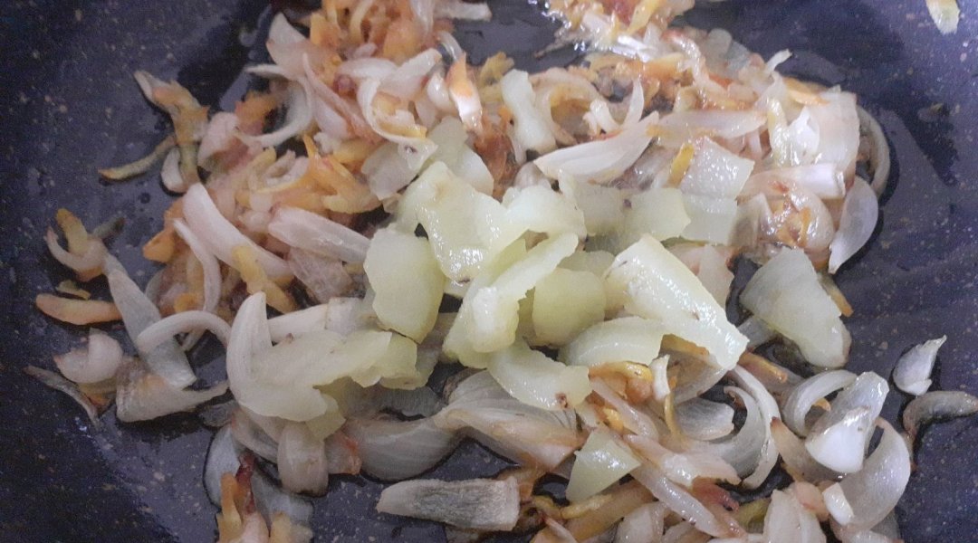 Добавила запечённый , почищенный , нарезанный перчик в обжарку.