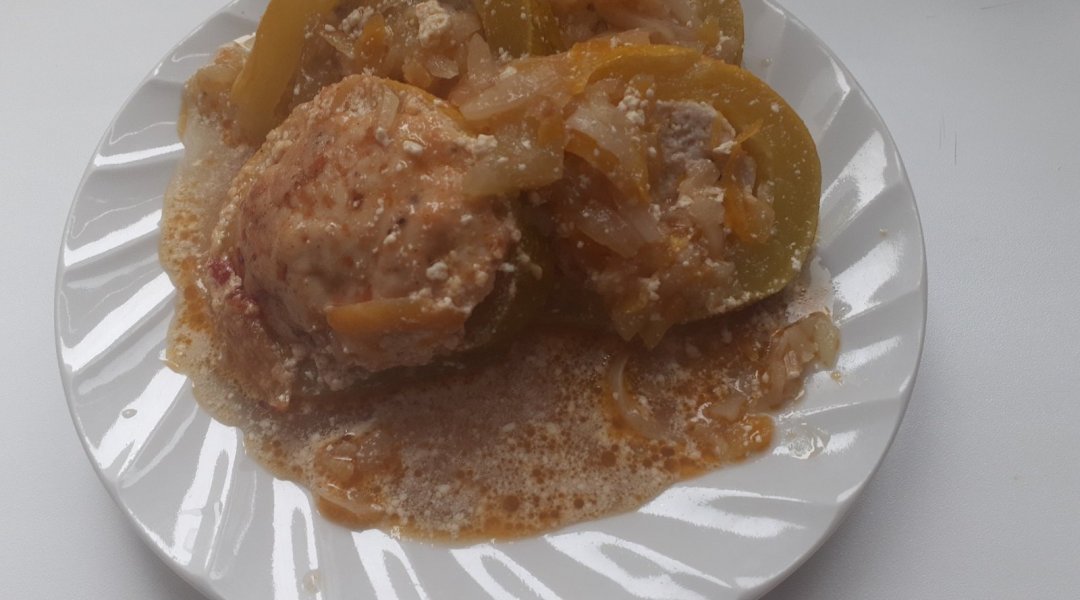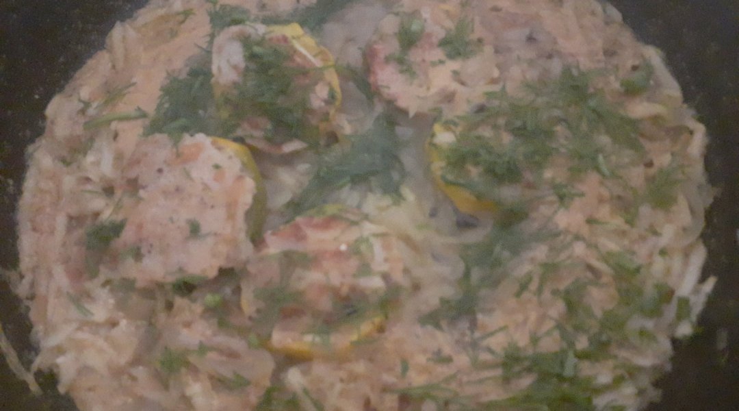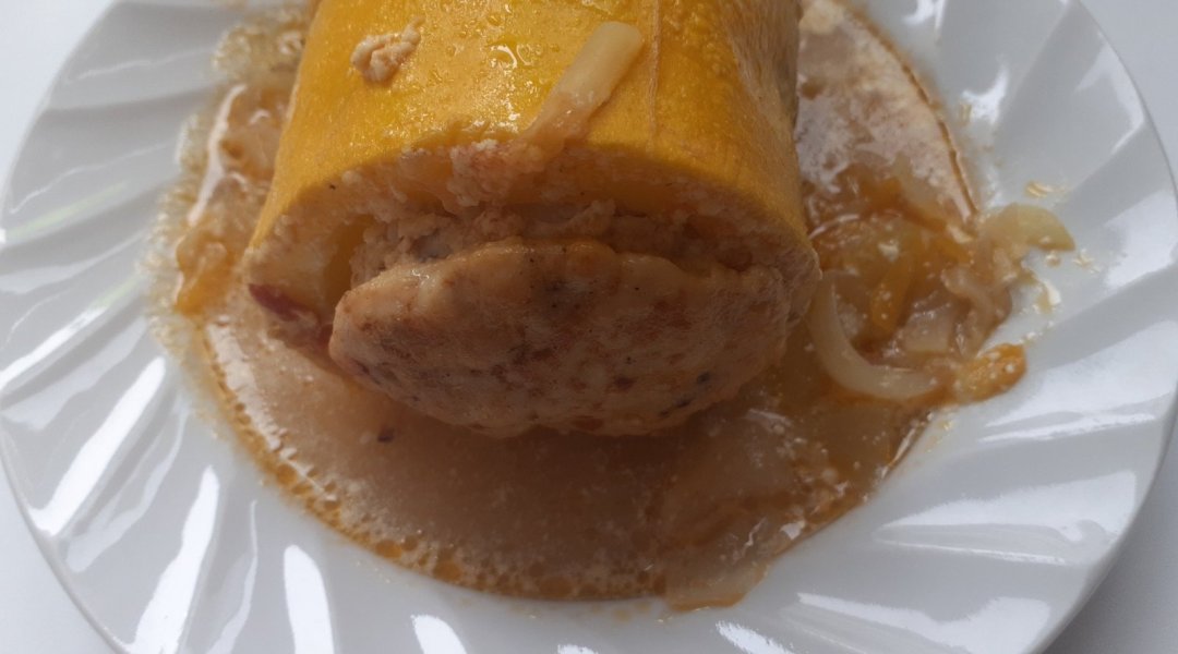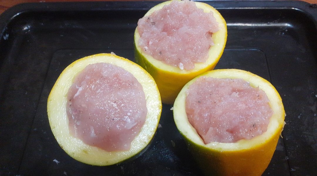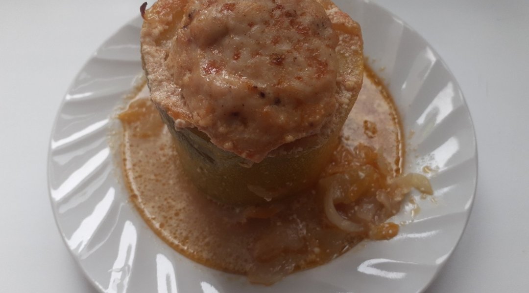 Кабачок фаршированный грудкой индейки и цыплёнка в сметанной заливке