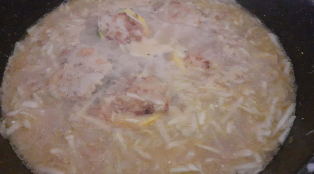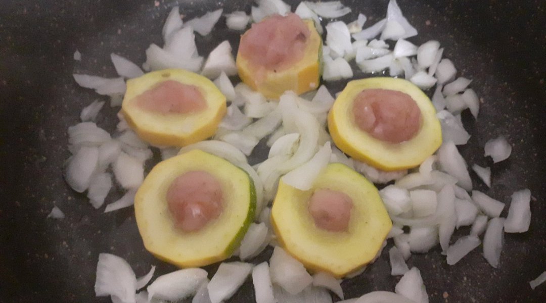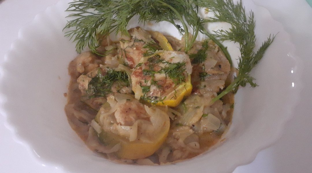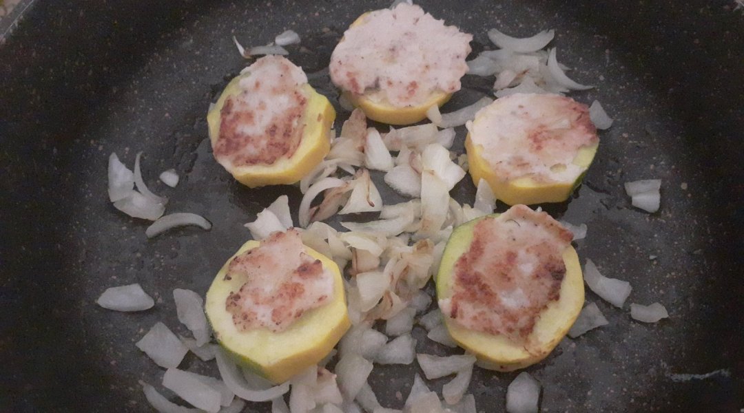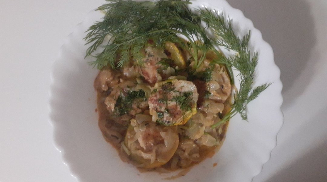 Кабачок фаршированный грудкой индейки и цыплёнка в сметанной заливке