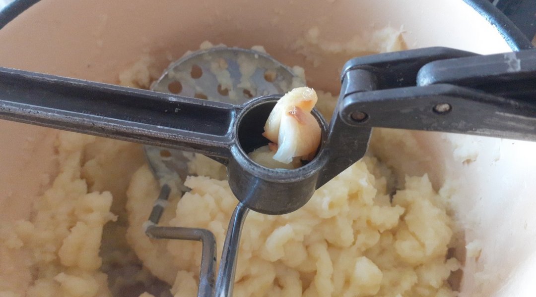 Очищенный запечённый чеснок, выжала в картофельное пюре через чеснокодавку и хорошо растерла.