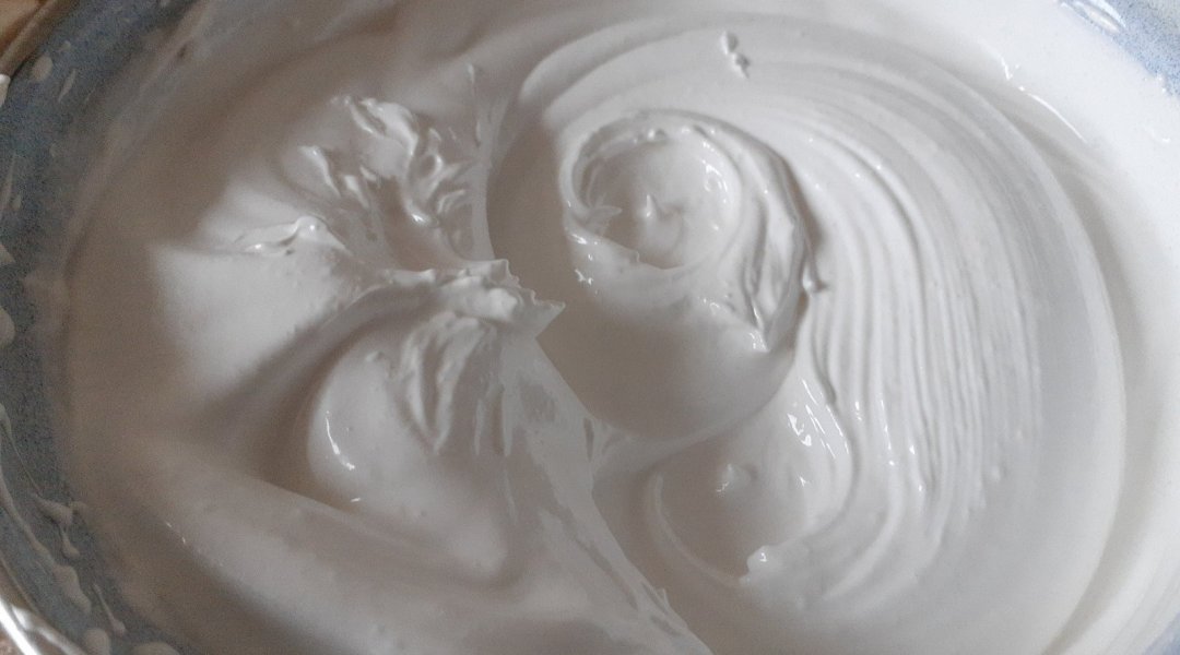 Яичные белки взбила с сахаром до того состояния что бы не выпадывали из перевёрнутой кастрюльки.
