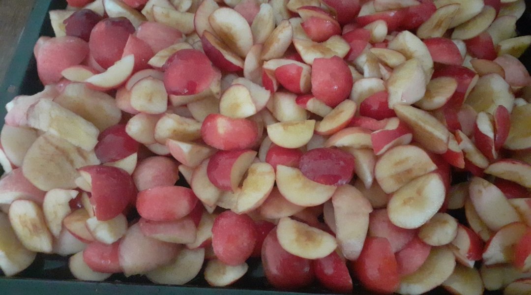 Яблочки помыла, почистила, порезала, запекла в духовочке 25 минут при 200 градусах. Переложила запечённые яблочки в кастрюльку и взбила блендером. Дала яблочной массе остыть и смешала её со взбитыми белками. Чашечку полученной массы отложила и поставила в холодильник. Листы дегидратора смазала оливковым маслицем. Вылила на них полученную массу и сушила 8 часов в дегидраторе. Затем достала оставленную массу из холодильника, смазала одиночные листики высушенной пастилы выложила их в несколько слёв . Поставила досушиваться дальше ещё на 4 часа. Сшила при температуре 70 градусов.