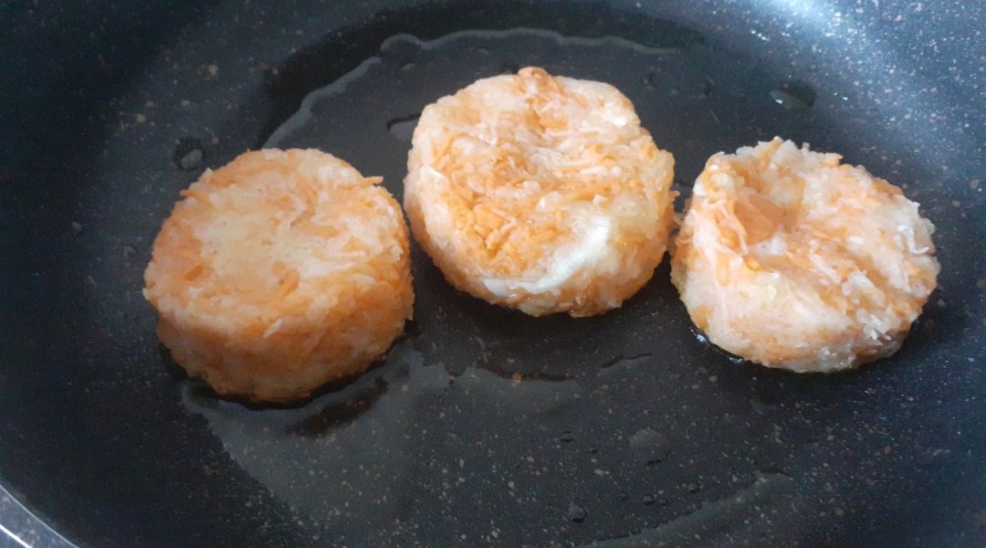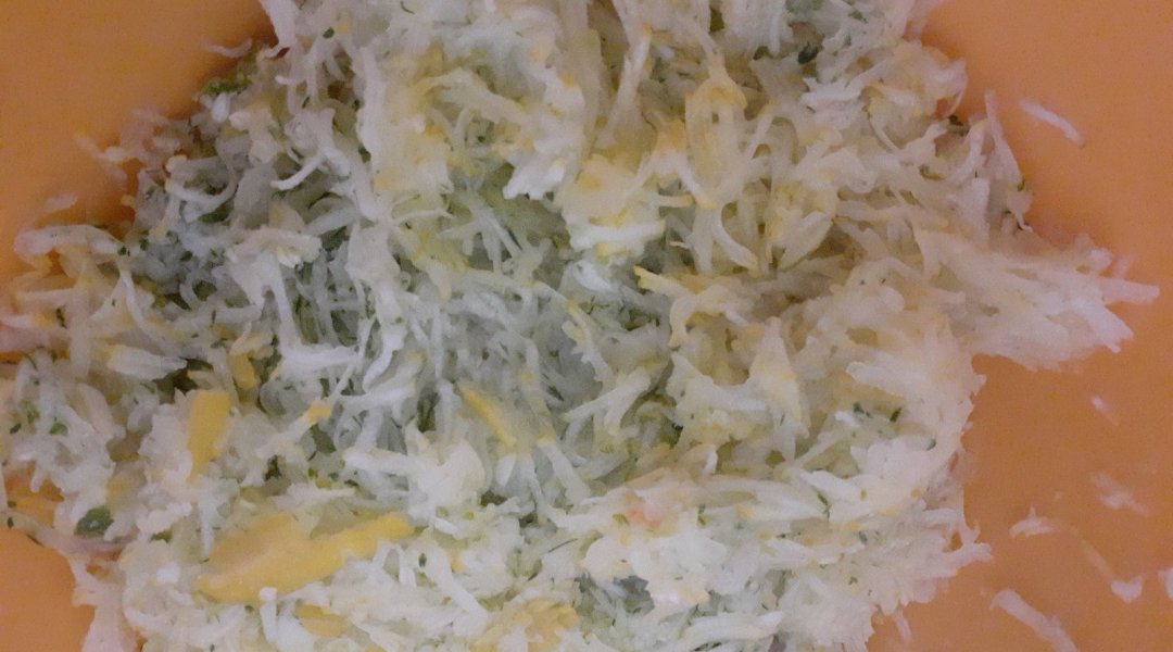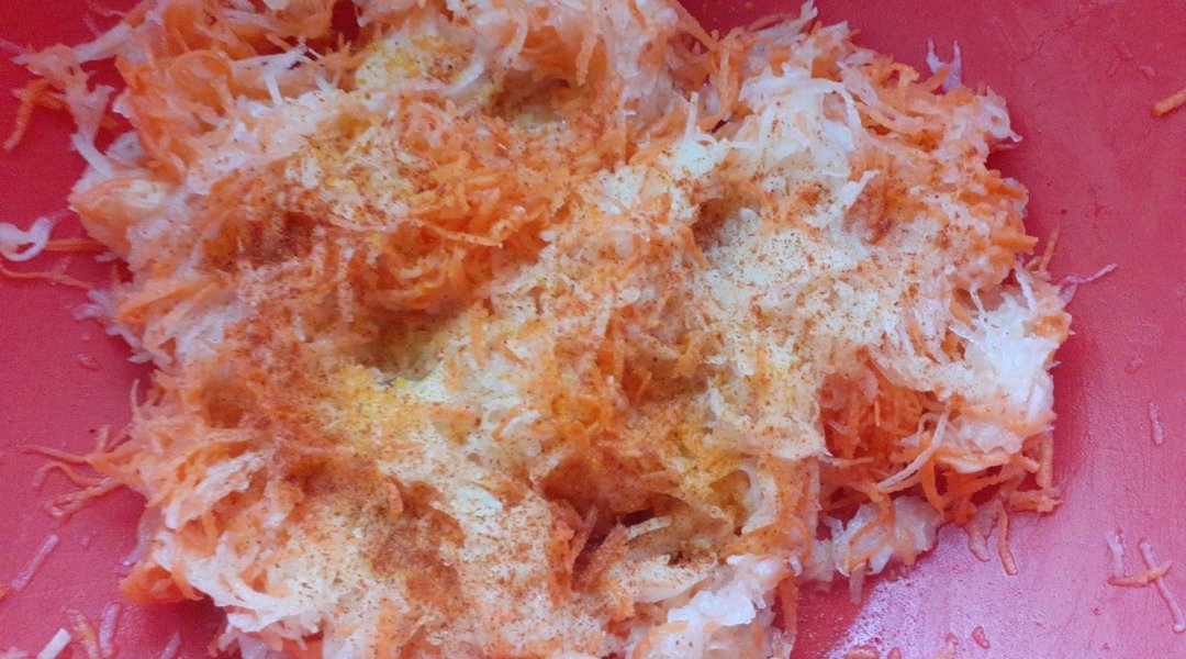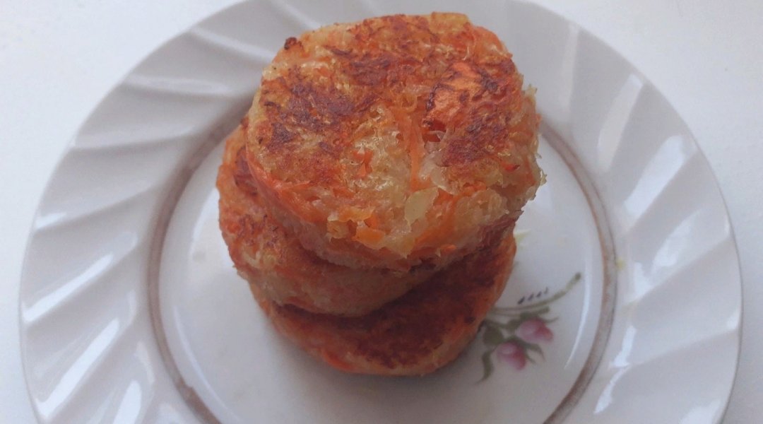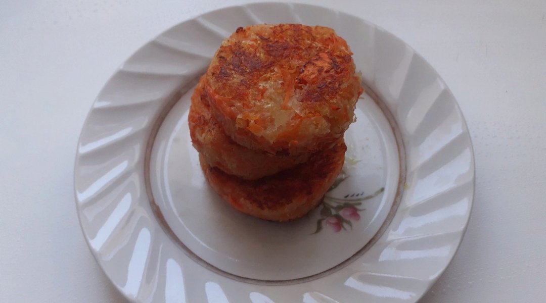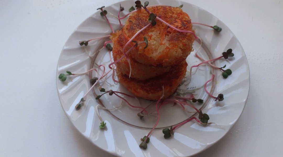 Рецепт взяла из интернета, захотелось попробовать, что за котлетки. Картофель, патисон, морковь, помыла, почистила, натерла на мелкой тёрочке, посолила, отжала лишнюю водицу, добавила специй и поджарила на оливковом маслице по 12 минут с каждой стороны. под крышечкой. Украсила микро зеленью редиса.
