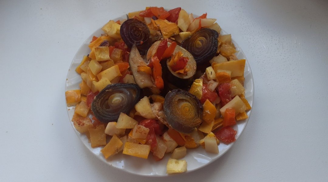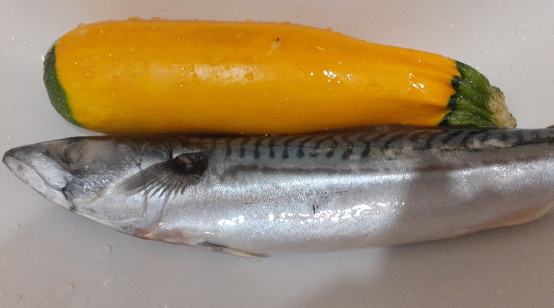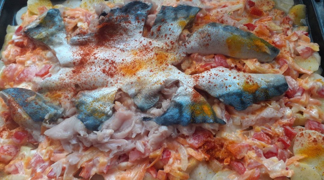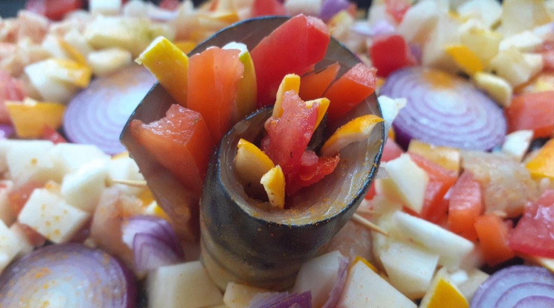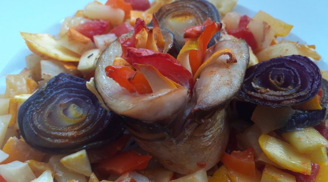 Скумбрию почистила, нарезала на тонкие пластики. Овощи помыла, почистила нарезала. Свернула из пластика скумбрии рулетик с овощами и закрепила зубочистками на время выпечки. Все овощи порезала кубиками, посолила, посыпала специями и выложила вокруг лета со скумбрией. Запекала в духовке 35 минут при 180 градусах. Готовый рулет после запекания выложила на тарелочку, убрала зубочистки скрепляющие его. Вокруг рулета выложила запечённые овощи. Блюдо готово.