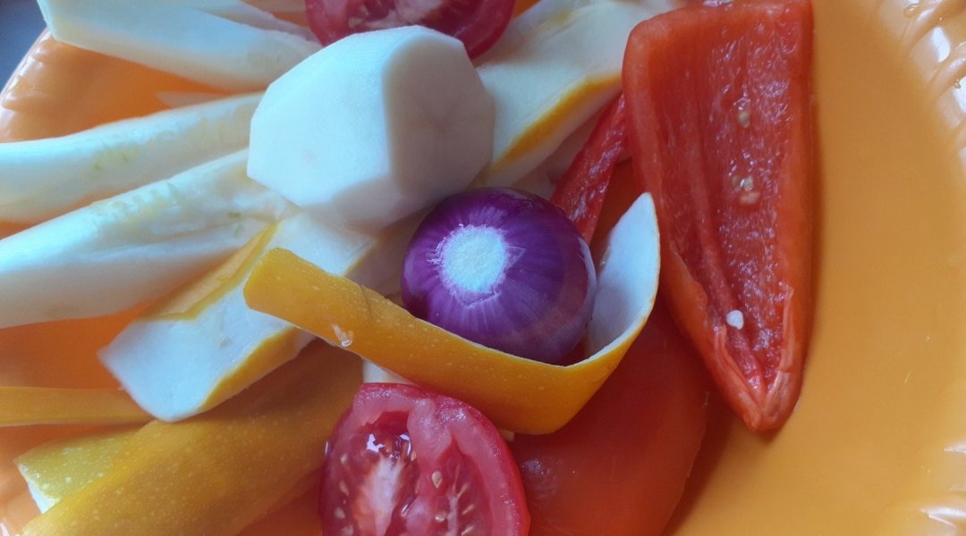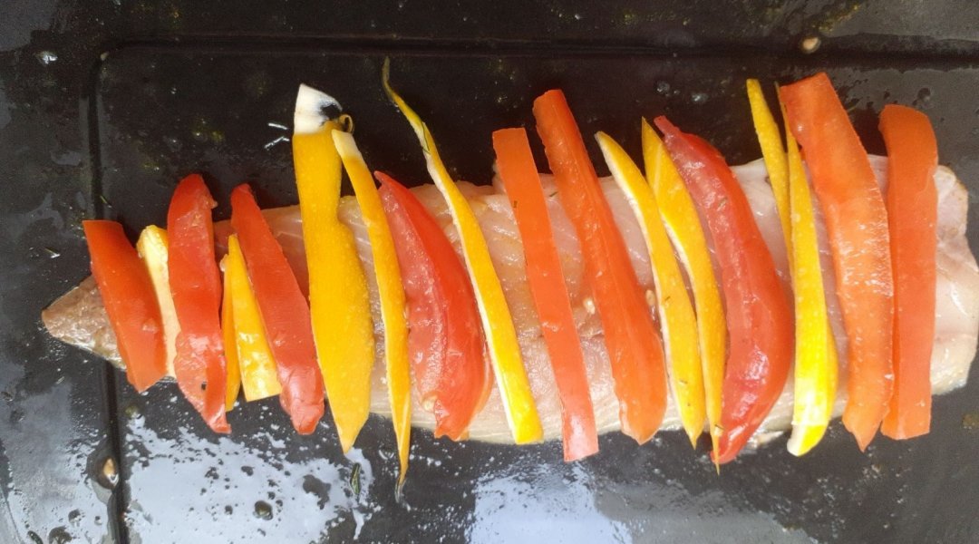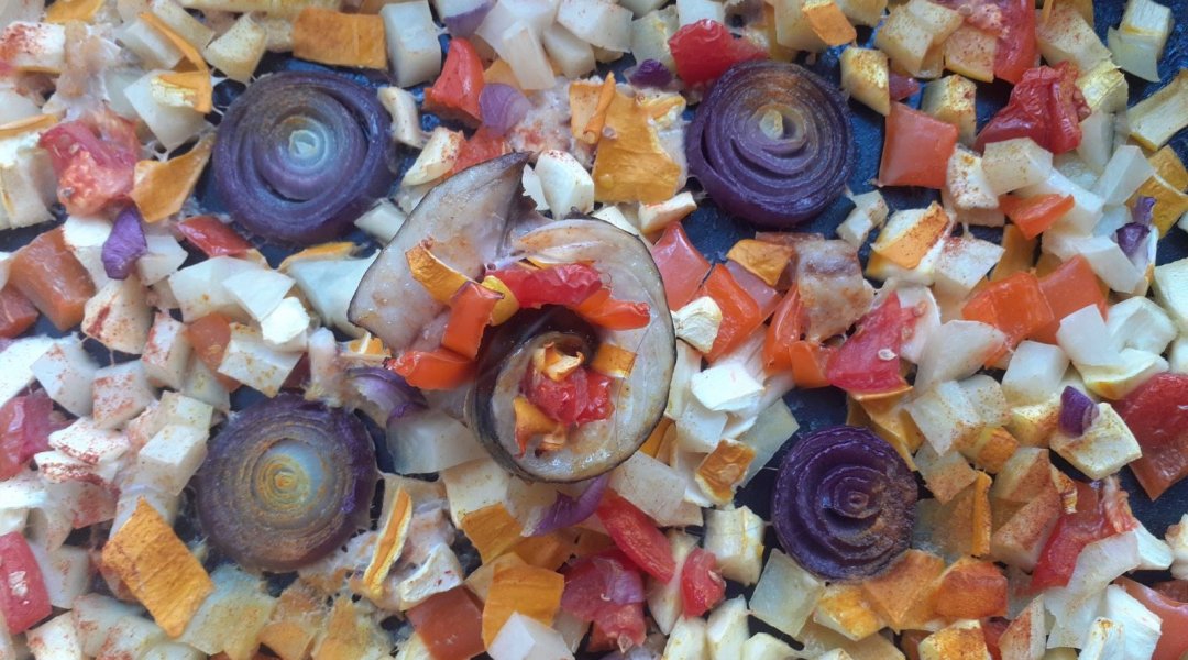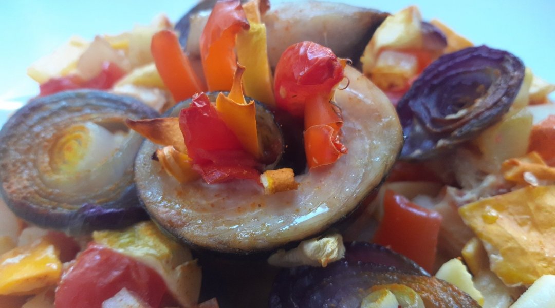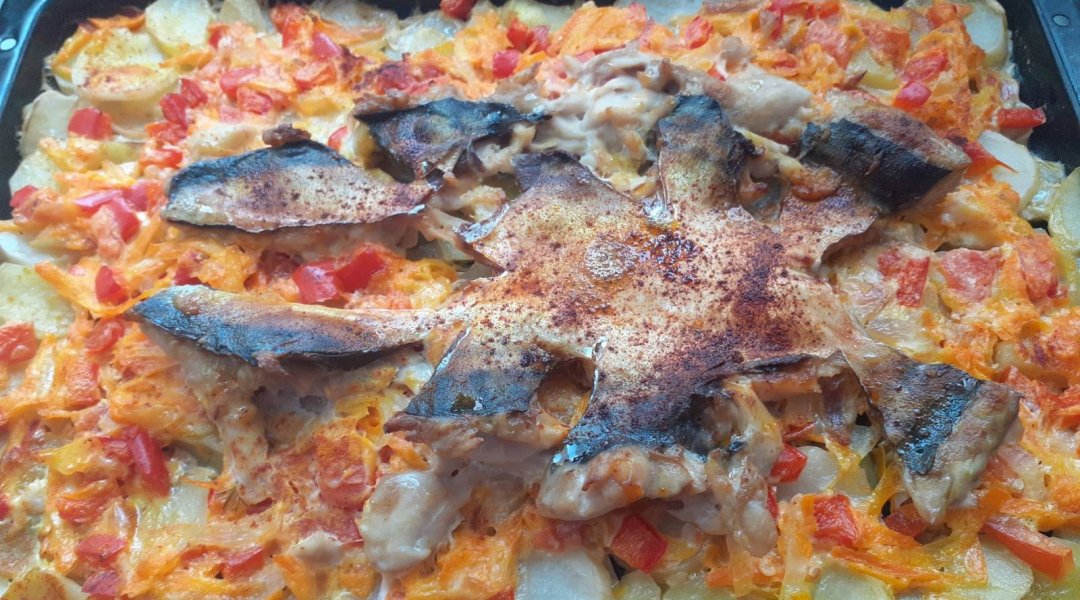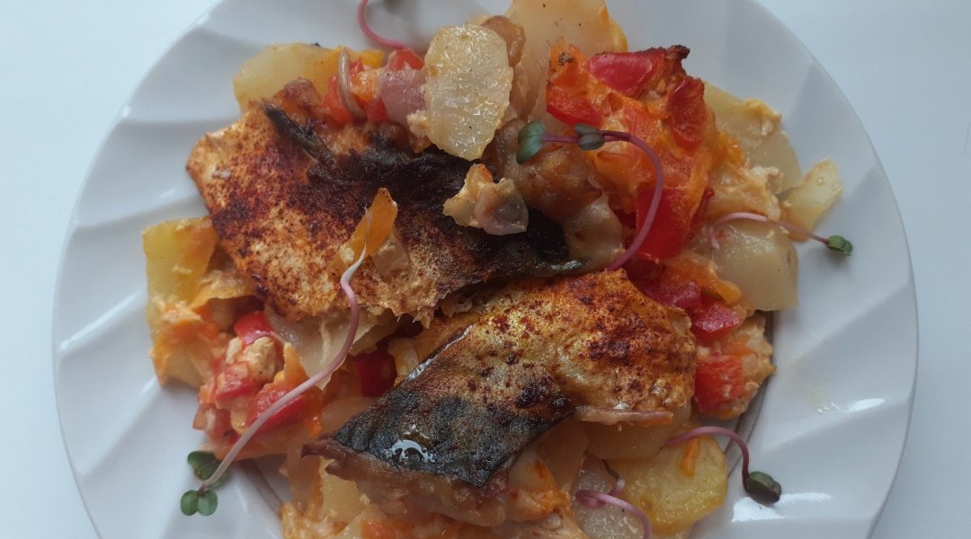Скумбрию почистила, нарезала на тонкие пластики. Овощи помыла, почистила нарезала. Свернула из пластика скумбрии рулетик с овощами и закрепила зубочистками на время выпечки. Все овощи порезала кубиками, посолила, посыпала специями и выложила вокруг лета со скумбрией. Запекала в духовке 35 минут при 180 градусах. Готовый рулет после запекания выложила на тарелочку, убрала зубочистки скрепляющие его. Вокруг рулета выложила запечённые овощи. Блюдо готово.